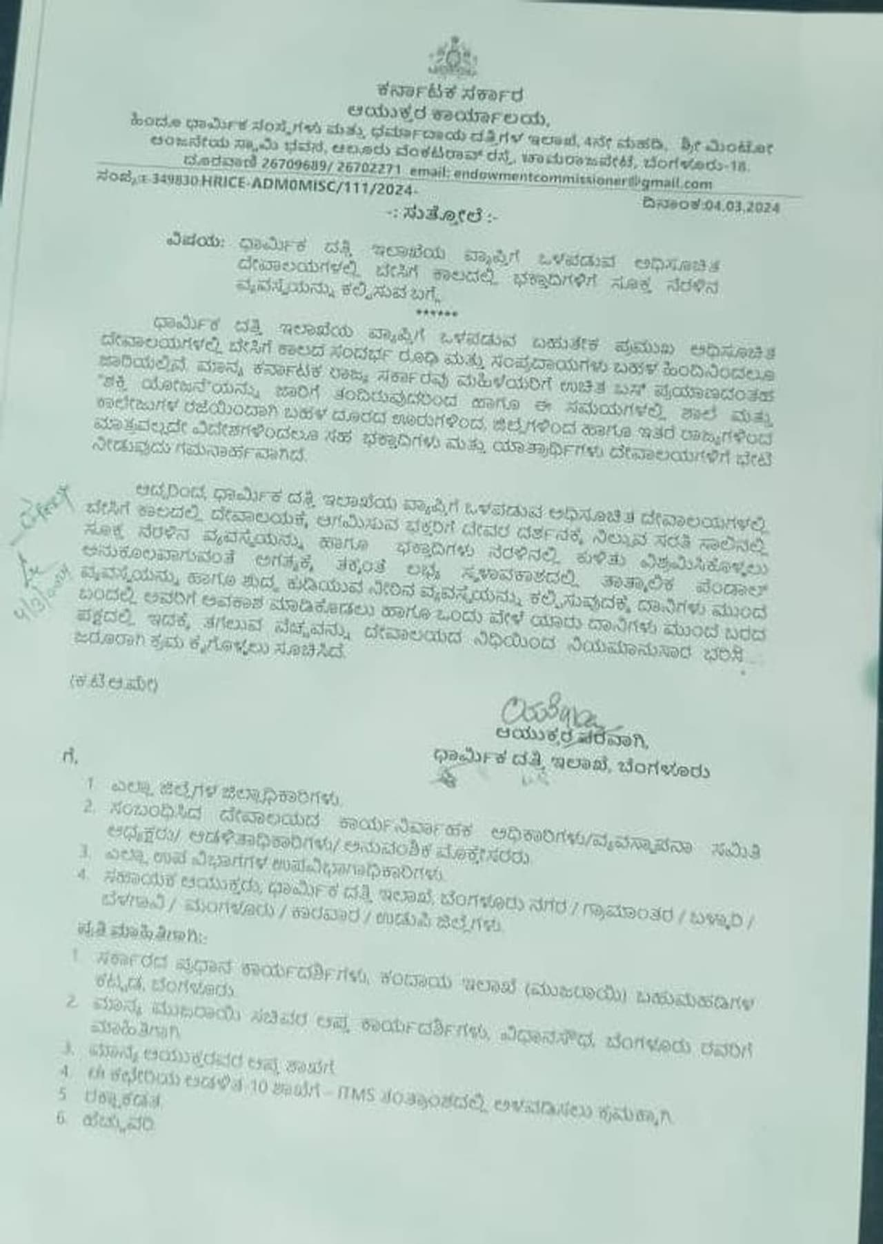 ರಾಜ್ಯದ ಎಲ್ಲ ಧಾರ್ಮಿಕ ದತ್ತಿ ಇಲಾಖೆಯ ದೇವಸ್ಥಾನಗಳಿಗೆ ಬರುವ ಭಕ್ತಾದಿಗಳಿಗೆ ಸೂಕ್ತ ನೆರಳು ಹಾಗೂ ಶುದ್ಧ ಕುಡಿಯುವ ನೀರಿನ ವ್ಯವಸ್ಥೆ ಮಾಡುವಂತೆ ಮುಜರಾಯಿ ಇಲಾಖೆಯಿಂದ ಆದೇಶ ಹೊರಡಿಸಲಾಗಿದೆ.
