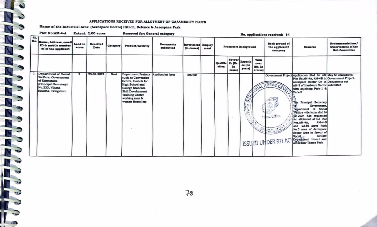 ಜಾಗ ಹಂಚಿಕೆ ಏಕಗವಾಕ್ಷಿ ಸಮಿತಿ ಸಮಾಜ ಕಲ್ಯಾಣ ಇಲಾಖೆ ಮನವಿ ಪುರಸ್ಕರಿಸಬಹುದು ಎಂದು ಶಿಫಾರಸು ಮಾಡಿತ್ತು. ಆದರೆ ಪ್ರಾಜೆಕ್ಟ್ ರಿಪೋರ್ಟ್ ಸಲ್ಲಿಸಿಲ್ಲ ಎಂಬ ಕಾರಣಕ್ಕೆ ಕೆಐಎಡಿಬಿ ಅರ್ಜಿ ಪರಿಗಣನೆಯನ್ನೇ ಮಾಡಿರಲಿಲ್ಲ.