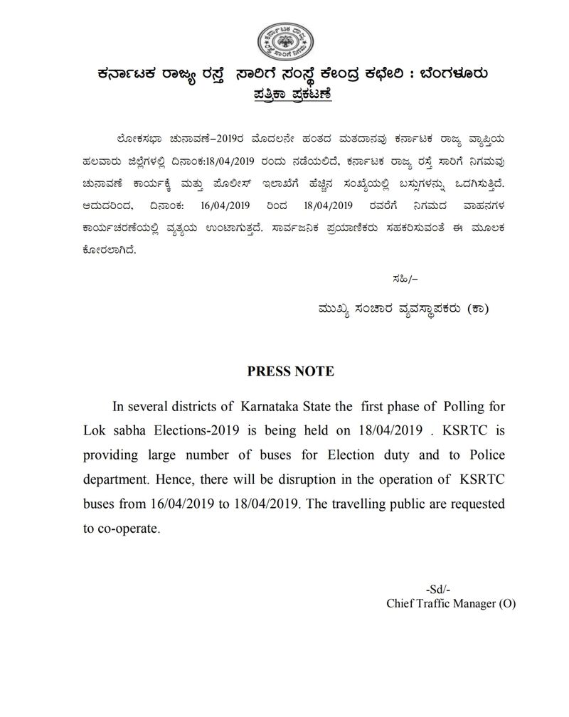ಚುನಾವಣೆಯ ಹಿಂದಿನ ಎರಡು ದಿನ ಹಾಗೂ ಚುನಾವಣೆಯ ದಿನ ಅಂದ್ರೆ ಏಪ್ರಿಲ್ 16, 17, 18 ರಂದು ಕೆಎಸ್ಆರ್ಟಿಸಿ ಬಸ್ ಸಂಚಾರದಲ್ಲಿ ವ್ಯತ್ಯಯವಾಗಲಿದೆ ಎಂದು ಕರ್ನಾಟಕ ರಾಜ್ಯ ಸಾರಿಗೆ ಸಂಸ್ಥೆ ಪ್ರಕಟಣೆಯಲ್ಲಿ ತಿಳಿಸಿದೆ.