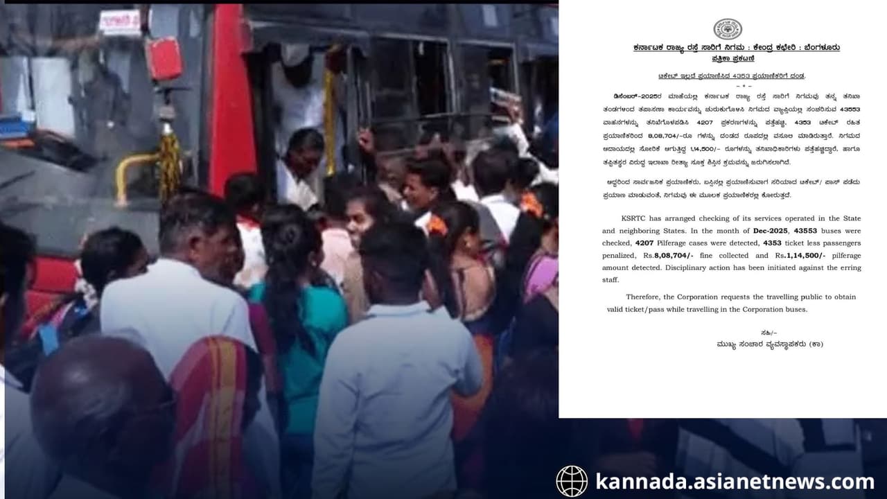 ರಾಜ್ಯ ಸರ್ಕಾರದ 'ಶಕ್ತಿ' ಯೋಜನೆಯಿಂದ ಬಸ್ಗಳಲ್ಲಿ ಜನದಟ್ಟಣೆ ಹೆಚ್ಚಾಗಿದ್ದು, ಇದನ್ನೇ ಬಳಸಿಕೊಂಡು ಟಿಕೆಟ್ ರಹಿತ ಪ್ರಯಾಣ ಮಾಡುವವರ ಸಂಖ್ಯೆ ಹೆಚ್ಚಾಗಿದೆ. ಡಿಸೆಂಬರ್ ತಿಂಗಳೊಂದರಲ್ಲೇ ಕೆಎಸ್ಆರ್ಟಿಸಿಯಲ್ಲಿ 4,353 ಟಿಕೆಟ್ ರಹಿತ ಪ್ರಯಾಣಿಕರನ್ನು ಪತ್ತೆಹಚ್ಚಿ 8 ಲಕ್ಷಕ್ಕೂ ಅಧಿಕ ದಂಡ ವಸೂಲಿ.