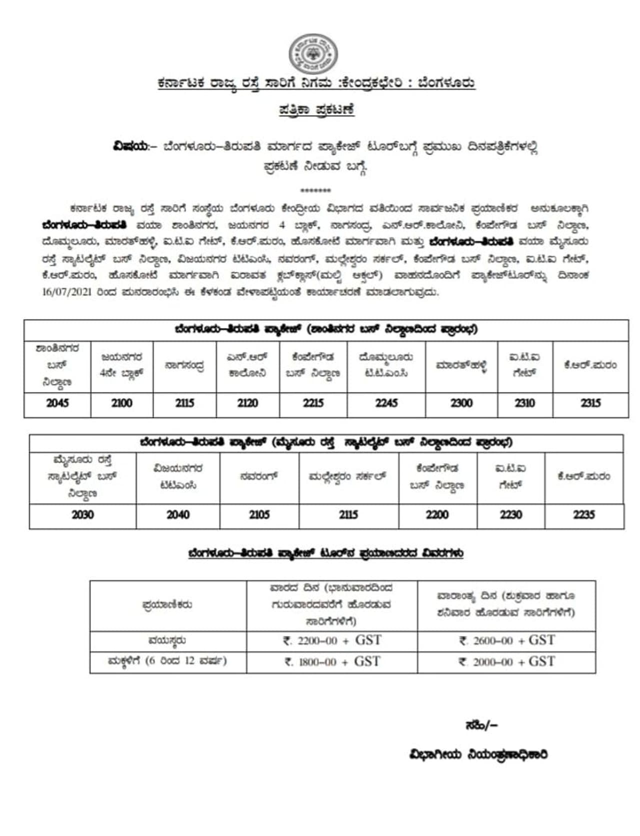 ಕೊರೊನಾ ಹಿನ್ನೆಲೆ ಎರಡು ತಿಂಗಳಿಂದ ಸ್ಥಗಿತಗೊಂಡಿದ ತಿರುಪತಿ ಪ್ಯಾಕೇಜ್ ಟೂರ್ ಜುಲೈ 16 ರಿಂದ ಆರಂಭವಾಗಲಿದೆ. ಐರಾವತ ಕ್ಲಬ್ ಕ್ಲಾಸ್ ಬಸ್ ನಲ್ಲಿ ಪ್ರಯಾಣ ಹಾಗೂ ತಿಮ್ಮಪ್ಪನ ದರ್ಶನಕ್ಕೆ ತೆರಳಬಹುದಾಗಿದೆ.