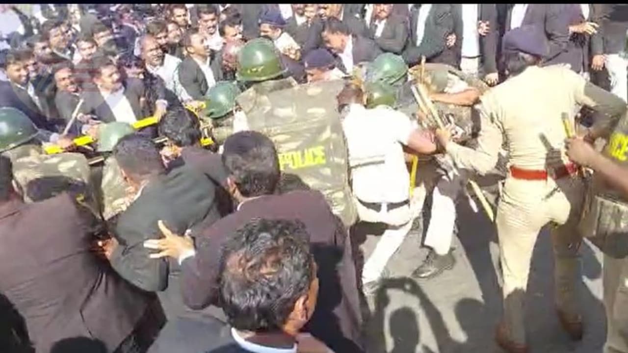 ರಾಜ್ಯದಲ್ಲಿ ವಕೀಲರ ರಕ್ಷಣಾ ಕಾಯ್ದೆ ಜಾರಿಗೆ ಆಗ್ರಹಿಸಿ ಅಖಿಲ ಭಾರತ ವಕೀಲರ ಒಕ್ಕೂಟ ವತಿಯಿಂದ ಸಾವಿರಾರು ವಕೀಲರು ರಾಷ್ಟ್ರೀಯ ಹೆದ್ದಾರಿಯಲ್ಲಿ ಪ್ರತಿಭಟನಾ ಮೆರವಣಿಗೆ ಮೂಲಕ ಸುವರ್ಣಸೌಧ ಮುತ್ತಿಗೆ ಹಾಕಲು ಹೊರಟಿದ್ದರು. ಈ ವೇಳೆ ಪೊಲೀಸರು ಅಡ್ಡ ಇಟ್ಟಿದ್ದ ಬ್ಯಾರಿಕೇಡ್ಗಳನ್ನು ಕಿತ್ತೆಸೆದು ತಳ್ಳಾಡಿದ ಘಟನೆ ನಡೆದಿದೆ.