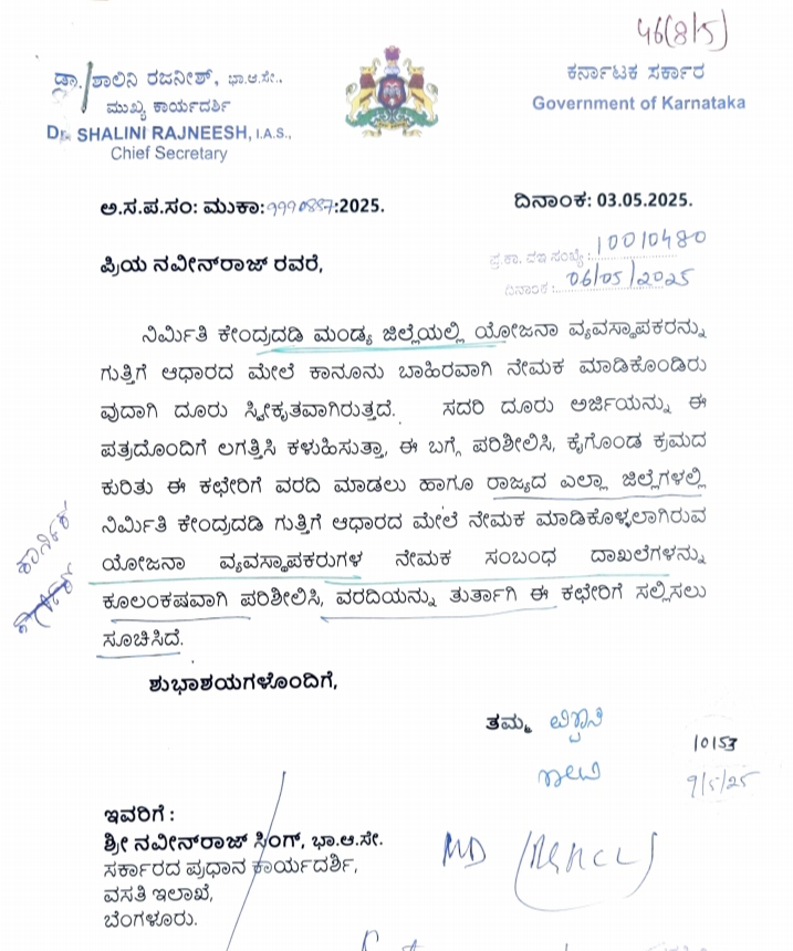 ಈ ಪಠ್ಯಕ್ಕೆ ತೀವ್ರವಾಗಿ ಸ್ಪಂದಿಸಿದ ರಾಜ್ಯ ಸರ್ಕಾರದ ಮುಖ್ಯ ಕಾರ್ಯದರ್ಶಿ ಡಾ. ಶಾಲಿನಿ ರಜನೀಶ್, ವಸತಿ ಇಲಾಖೆಯ ಪ್ರಧಾನ ಕಾರ್ಯದರ್ಶಿ ನವೀನ್ ರಾಜ್ ಸಿಂಗ್ ಅವರಿಗೆ ಪತ್ರ ಬರೆದು ವಿಶೇಷ ಪರಿಶೀಲನೆ ನಡೆಸುವಂತೆ ಸೂಚನೆ ನೀಡಿದ್ದಾರೆ. ಈ ಆದೇಶದಂತೆ, ರಾಜ್ಯದ ಎಲ್ಲಾ ಜಿಲ್ಲೆಗಳ ನಿರ್ಮಿತಿ ಕೇಂದ್ರಗಳಲ್ಲಿ ನೇಮಕಾತಿಯ ಕುರಿತು ದಾಖಲೆಗಳನ್ನು ಪರಿಶೀಲಿಸಿ, ತಕ್ಷಣದ ವರದಿ ಸಲ್ಲಿಸುವಂತೆ ಸೂಚನೆ ನೀಡಲಾಗಿದೆ.