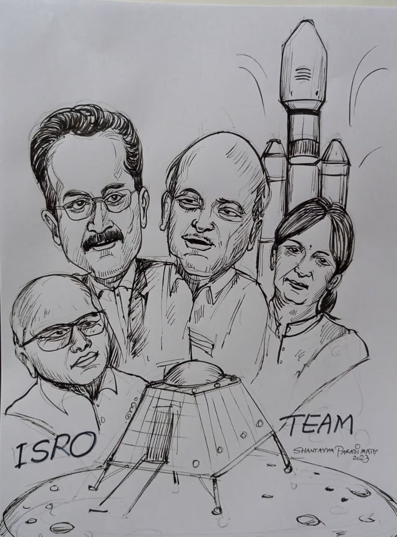 ಚಂದ್ರಯಾನ -3 ಉಡಾವಣೆ ಯಶಸ್ವಿಯಾದ ಹಿನ್ನೆಲೆಯಲ್ಲಿ ದಾವಣಗೆರೆ ನಗರದ ಹಿರಿಯ ಚಿತ್ರಕಲಾ ಶಿಕ್ಷಕ, ಹಿರಿಯ ಕಲಾವಿದ ಶಾಂತಯ್ಯ ಪರಡಿಮಠ ಅವರು ಇಸ್ರೋ ವಿಜ್ಞಾನಿಗಳ ತಂಡವನ್ನ ಚಿತ್ರ ಬಿಡಿಸುವ ಮೂಲಕ ಗೌರವಿಸಿದ್ದಾರೆ.