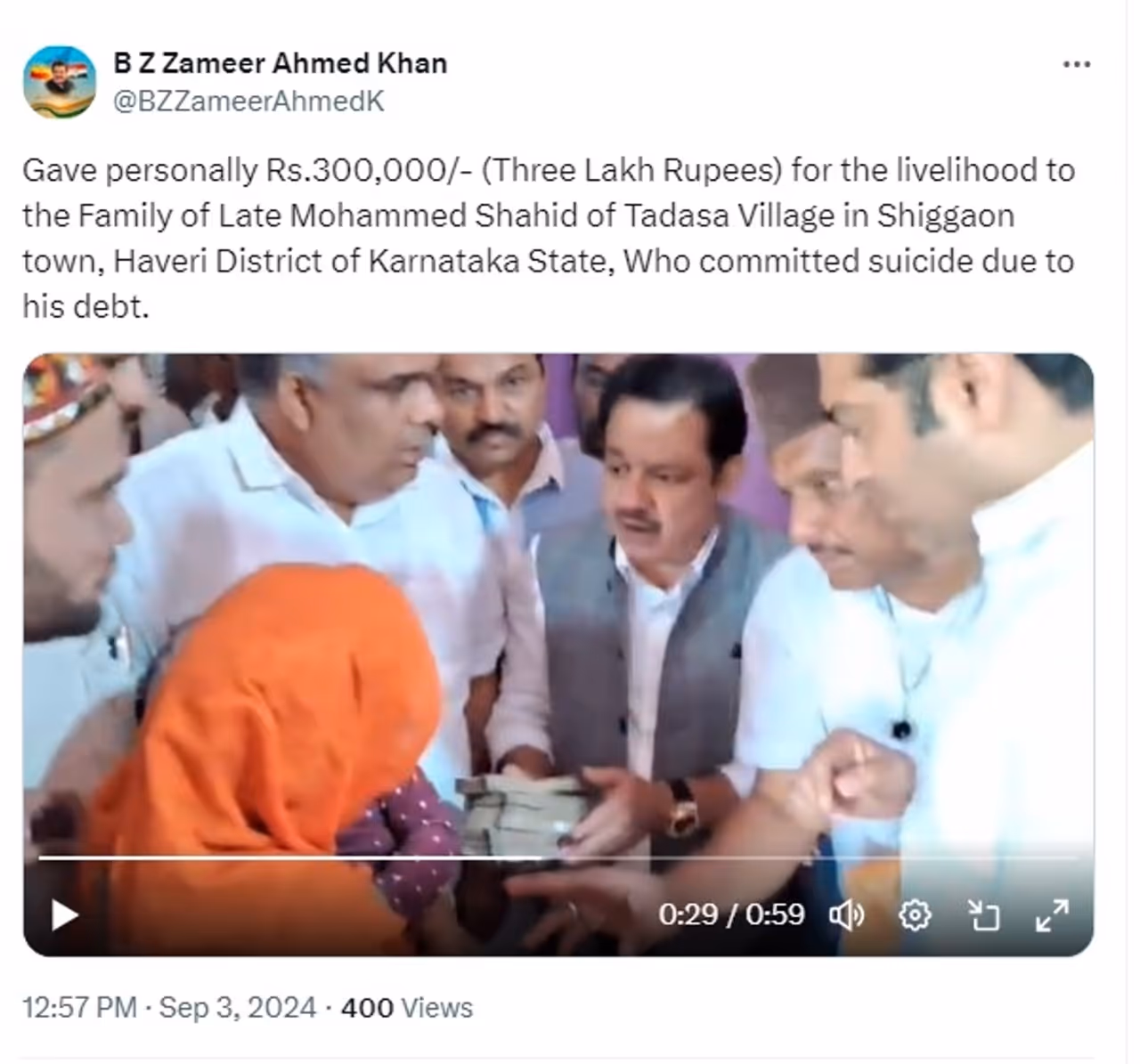 'ಸಾಲಬಾಧೆಯಿಂದ ಆತ್ಮಹತ್ಯೆ ಮಾಡಿಕೊಂಡ ಕರ್ನಾಟಕ ರಾಜ್ಯದ ಹಾವೇರಿ ಜಿಲ್ಲೆಯ ಶಿಗ್ಗಾಂವ್ ಪಟ್ಟಣದ ತಡಸ ಗ್ರಾಮದ ದಿವಂಗತ ಮಹಮ್ಮದ್ ಶಾಹಿದ್ ಅವರ ಕುಟುಂಬಕ್ಕೆ ಜೀವನೋಪಾಯಕ್ಕಾಗಿ ವೈಯಕ್ತಿಕವಾಗಿ ರೂ.300,000/- (ಮೂರು ಲಕ್ಷ ರೂಪಾಯಿ) ನೀಡಿದ್ದೇನೆ' ಎಂದು ಜಮೀರ್ ಅಹ್ಮದ್ ಖಾನ್ ಬರೆದುಕೊಂಡಿದ್ದು, ಅದರ ವಿಡಿಯೋವನ್ನು ಕೂಡ ಹಂಚಿಕೊಂಡಿದ್ದಾರೆ. ನೋಟಿನ ಕಟ್ಟುಗಳನ್ನು ಹಿಡಿದುಕೊಂಡಿರುವ ಜಮೀರ್ ಅಹ್ಮದ್ ಅದನ್ನು ಮಹಿಳೆಗೆ ನೀಡುತ್ತಾರೆ.