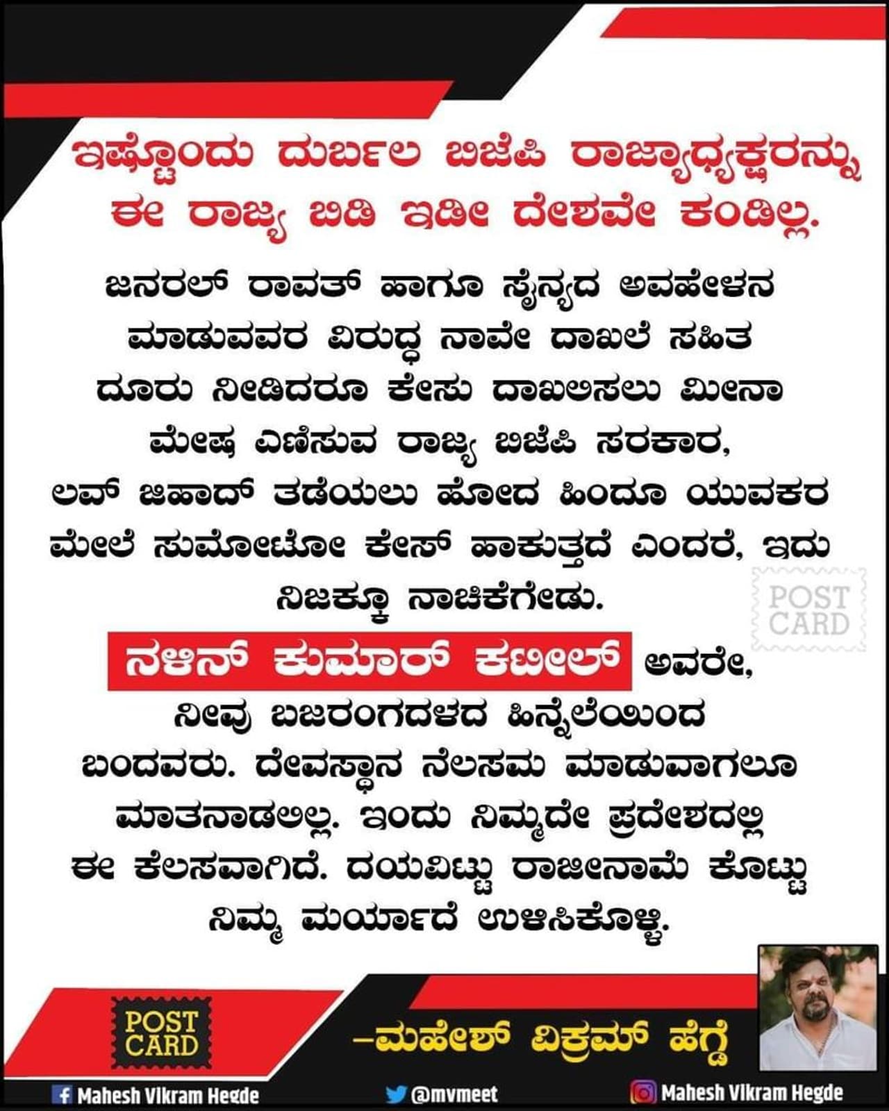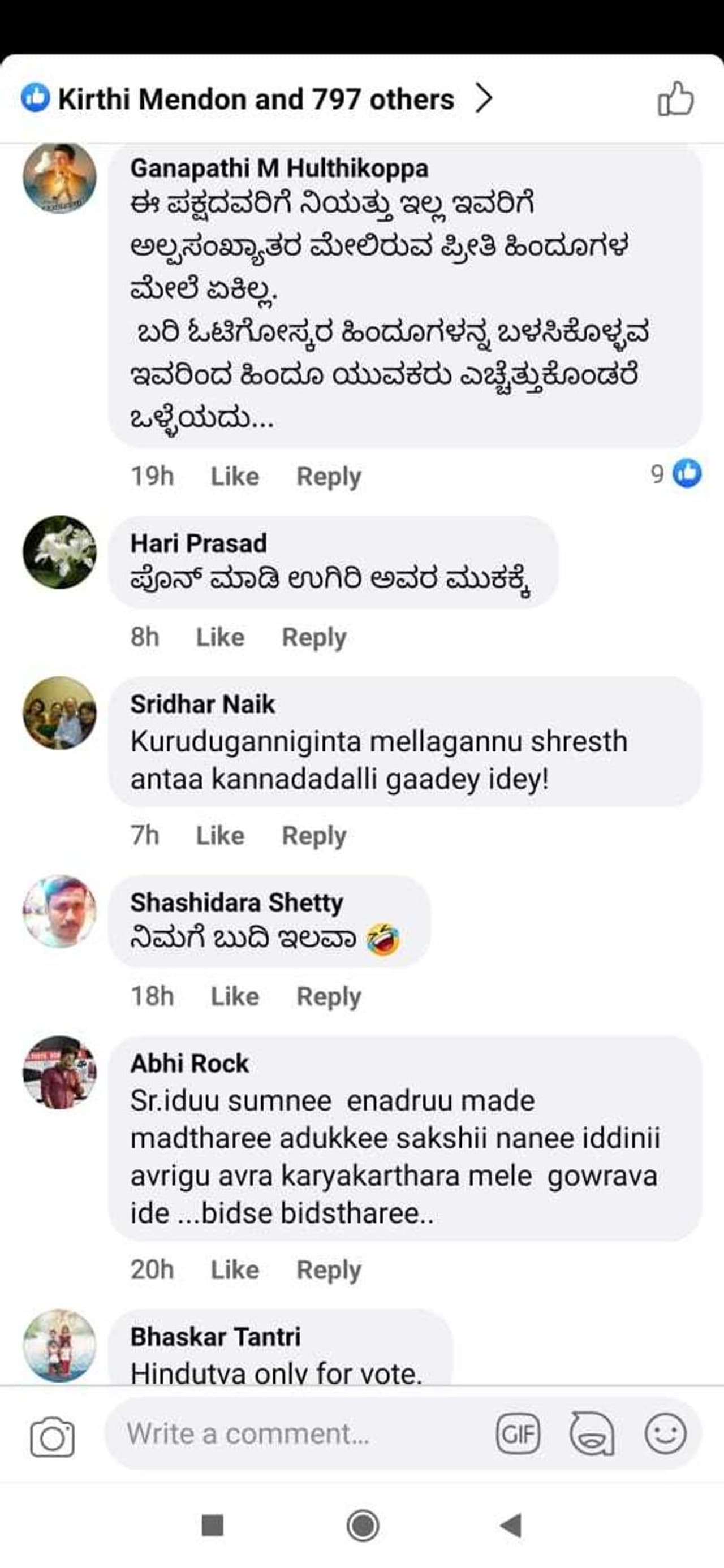 ಕರಾವಳಿಯ ಬಿಜೆಪಿ ಶಾಸಕರು, ಸಂಸದರು ಮತ್ತು ಬಿಜೆಪಿ ಸರ್ಕಾರಕ್ಕೆ ಬಳೆ ಕಳುಹಿಸುತ್ತಿದ್ದೇವೆ ಎಂದೂ ಅನೇಕ ಕಾರ್ಯಕರ್ತರು ಪೋಸ್ಟ್ ಮಾಡಿದ್ದು, ನಿಮಗೆ ತಾಕತ್ತಿಲ್ಲದಿದ್ದರೆ ರಾಜೀನಾಮೆ ಕೊಟ್ಟು ಬಿಡಿ ಅಂತ ನಳಿನ್ ಕಟೀಲ್ ವಿರುದ್ಧ ಕಿಡಿ ಕಾರಿದ್ದಾರೆ.