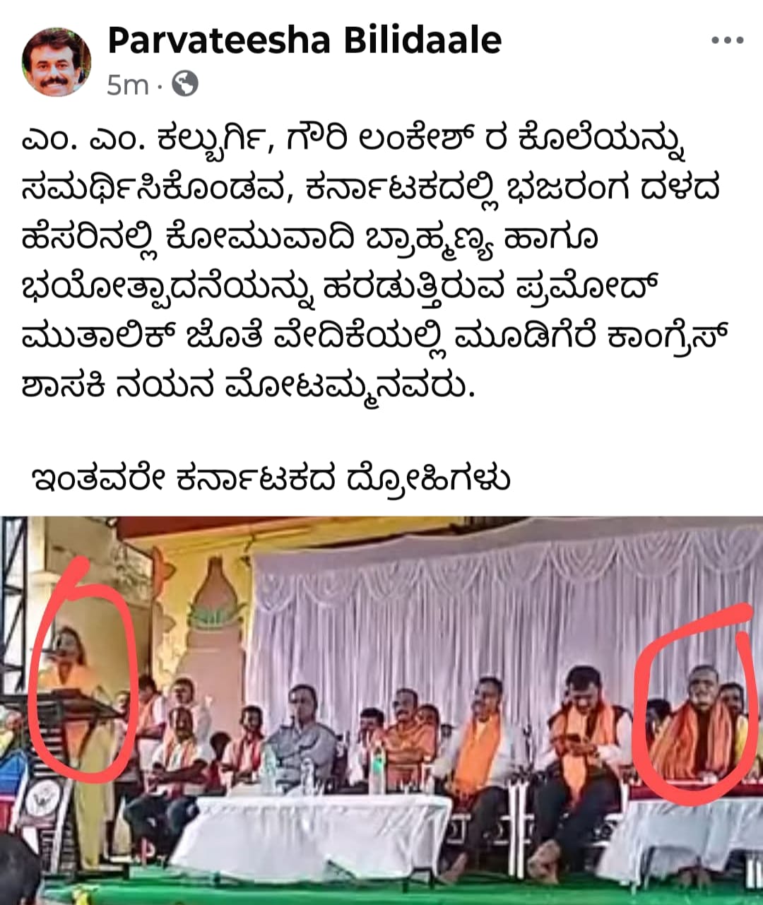 ನಿನ್ನೆ ಮೂಡಿಗೆರೆಯಲ್ಲಿ ಹಿಂದು ಸಂಗಮ ಮಹಾರ್ಯಾಲಿ ಮತ್ತು ನೂತನ ಭಗವಧ್ವಜ ಕಟ್ಟೆ ಗುದ್ದಲಿ ಪೂಜೆ ಕಾರ್ಯಕ್ರಮದಲ್ಲಿ ಭಾಗಿಯಾಗಿದ್ದರು. ಈ ಬಗ್ಗೆ ಸಾಮಾಜಿಕ ಜಾಲತಾಣದಲ್ಲಿ ಭಾರೀ ಪರ ವಿರೋಧ ಚರ್ಚೆಗಳು ನಡೆದಿದ್ದವು. ಪಾರ್ವತೀಶ ಬಿಳಿದಾಲೆ ಎನ್ನುವವರು 'ಎಂ.ಎಂ. ಕಲಬುರ್ಗಿ, ಗೌರಿ ಲಂಕೇಶ್ ಅವರ ಕೊಲೆಯನ್ನು ಸಮರ್ಥಿಸಿಕೊಂಡವರ, ಕರ್ನಾಟಕದಲ್ಲಿ ಭಜರಂಗ ದಳದ ಹೆಸರಿನಲ್ಲಿ ಕೋಮುವಾದಿ ಬ್ರಾಹ್ಮಣ್ಯ ಹಾಗೂ ಭಯೋತ್ಪಾದನೆಯನ್ನು ಹರಡುತ್ತಿರುವ ಪ್ರಮೋದ್ ಮುತಾಲಿಕ್ ಜೊತೆ ವೇದಿಕೆಯಲ್ಲಿ ಮೂಡಿಗೆರೆ ಕಾಂಗ್ರೆಸ್ ಶಾಸಕಿ ನಯನಾ ಮೋಟಮ್ಮನವರು. ಇಂಥವರೇ ಕರ್ನಾಟಕ ದ್ರೋಹಿಗಳು' ಎಂದು ಪೋಸ್ಟ್ ಹಂಚಿಕೊಂಡಿದ್ದರು. ಹೀಗೆ ಹಲವು ಪೋಸ್ಟ್ಗಳು ತಮ್ಮ ಪರ-ವಿರೋಧ ಬಂದಿದ್ದಕ್ಕಾಗಿ ಇದೀಗ ಸ್ಪಷ್ಟನೆ ಕೊಡುವಂತೆ ನಯನಾ ಮೋಟಮ್ಮ ಒಂದು ಸಂದೇಶ ಬರೆದು ಪೋಸ್ಟ್ ಮಾಡಿಕೊಂಡಿದ್ದಾರೆ.