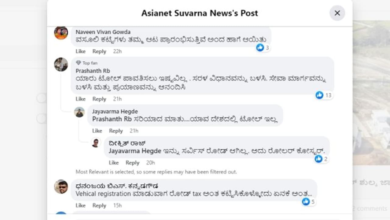 ಟೋಲ್ ಸಂಗ್ರಹಕ್ಕೆ ಪರ-ವಿರೋಧ: ಬೆಂಗಳೂರು ಮೈಸೂರು ದಶಪಥ ರಸ್ತೆಗೆ ಟೋಲ್ ಆರಂಭವಾಗಲಿದೆ ಎಂಬ 'ಏಷ್ಯಾನೆಟ್ ಡಿಜಿಟಲ್ ನ್ಯೂಸ್' ಹಂಚಿಕೊಂಡ ಸುದ್ದಿಗೆ ಸಾಮಾಜಿಕ ಜಾಲತಾಣದಲ್ಲಿ ಪರ - ವಿರೋಧ ವ್ಯಕ್ತವಾಗಿದೆ. ಕೆಲವರು ಸರ್ಕಾರ ಮತ್ತು ರಾಷ್ಟ್ರೀಯ ಹೆದ್ದಾರಿ ಪ್ರಾಧಿಕಾರಕ್ಕೆ ತರಾಟೆ ತೆಗೆದುಕೊಂಡಿದ್ದಾರೆ. ಇನ್ನು ಕೆಲವರು ಜಾಗತಿಕವಾಗಿ ನಮ್ಮ ದೇಶದಲ್ಲಿ ಮಾತ್ರವಲ್ಲ, ಅಭಿವೃದ್ಧಿ ಹೊಂದಿದ ದೇಶಗಳು ಒಳಗೊಂಡಂತೆ ಬಹುತೇಕ ದೇಶಗಳಲ್ಲಿ ರಸ್ತೆಯ ಟೋಲ್ ವಸೂಲಿ ಮಾಡಲಾಗುತ್ತಿದೆ. ನಮ್ಮ ದೇಶದಲ್ಲಿ ಟೋಲ್ ವಸೂಲಿ ಮಾಡುವುದರಲ್ಲಿ ಯಾವುದೇ ಉತ್ಪ್ರೇಕ್ಷೆಯಲ್ಲ. ಇನ್ನು ಯಾರು ಟೋಲ್ ಕಟ್ಟಲು ಸಾಧ್ಯವಿಲ್ಲವೋ ಅವರು ಸರ್ವಿಸ್ ರಸ್ತೆಯಲ್ಲಿ ಹೋಗಬಹುದು ಎಂದು ನೆಟಿಜೆನ್ಗಳು ಸಾಮಾಜಿಕ ಜಾಲತಾಣದಲ್ಲಿ ಪರ ವಿರೋಧ ವ್ಯಕ್ತಪಡಿಸಿದ್ದಾರೆ.