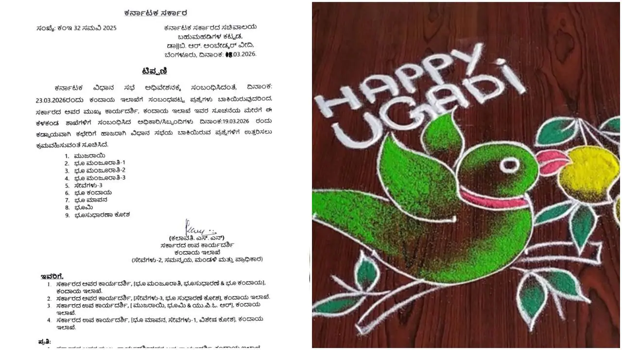 ಕಂದಾಯ ಇಲಾಖೆಯ ಅಪರ ಮುಖ್ಯ ಕಾರ್ಯದರ್ಶಿ ರಾಜೇಂದ್ರ ಕುಮಾರ್ ಕಠಾರಿಯಾ ಅವರ ನಿರ್ದೇಶನದಂತೆ, ಮಾರ್ಚ್ 23, 2026ರಂದು ವಿಧಾನಸಭೆಯಲ್ಲಿ ಕಂದಾಯ ಇಲಾಖೆಗೆ ಸಂಬಂಧಿಸಿದ ಪ್ರಶ್ನೆಗಳು ಚರ್ಚೆಗೆ ಬಾಕಿ ಇರುವುದರಿಂದ, ಅವುಗಳಿಗೆ ಸಮರ್ಪಕ ಉತ್ತರ ನೀಡಲು ಪೂರ್ವ ಸಿದ್ಧತೆ ಅಗತ್ಯವಿದೆ ಎಂದು ತಿಳಿಸಲಾಗಿದೆ. ಈ ಹಿನ್ನೆಲೆಯಲ್ಲಿ ಮಾರ್ಚ್ 19ರಂದು ಯುಗಾದಿ ಹಬ್ಬದ ದಿನವೂ ಅಧಿಕಾರಿಗಳು ಹಾಗೂ ಸಿಬ್ಬಂದಿಗಳು ಕಡ್ಡಾಯವಾಗಿ ಹಾಜರಾಗುವಂತೆ ಆದೇಶಿಸಲಾಗಿದೆ.