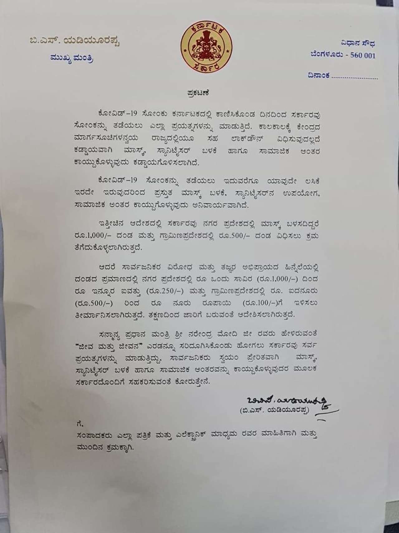 ಈ ಕುರಿತು ಹೇಳಿಕೆ ನೀಡಿರುವ ಮುಖ್ಯಮಂತ್ರಿ ಸಿಎಂ ಬಿಎಸ್ ಯಡಿಯೂರಪ್ಪ, ಪ್ರಧಾನಿಗಳು ಹೇಳಿರುವಂತೆ ಜೀವ ಮತ್ತು ಜೀವನ ಎರಡೂ ಮುಖ್ಯ. ಸಾರ್ವಜನಿಕರು ಮಾಸ್ಕ್ ಮತ್ತು ಸ್ಯಾನಿಟೈಸರ್ ಕಡ್ಡಾಯವಾಗಿ ಬಳಸಿ ಎಂದು ಸಾರ್ವಜನಿಕರಿಗೆ ಮನವಿ ಮಾಡಿಕೊಂಡಿದ್ದಾರೆ.