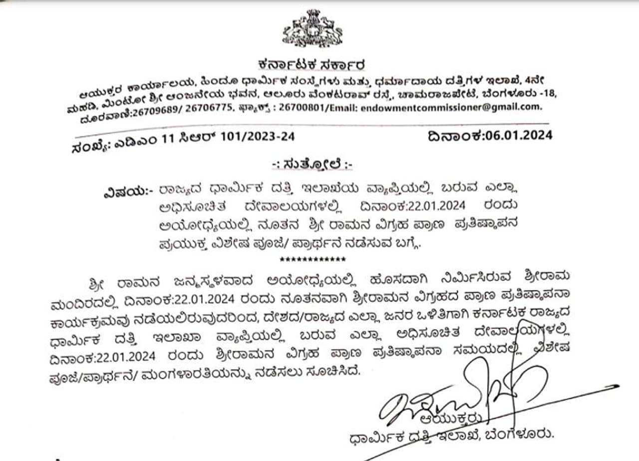 ಶ್ರೀ ರಾಮನ ಜನ್ಮಸ್ಥಳವಾದ ಅಯೋಧ್ಯೆಯಲ್ಲಿ ಹೊಸದಾಗಿ ನಿರ್ಮಿಸಿರುವ ರಾಮ ಮಂದಿರದಲ್ಲಿ ದಿನಾಂಕ ಜ.22ರಂದು ನೂತನವಾಗಿ ಶ್ರೀರಾಮನ ವಿಗ್ರಹದ ಪ್ರಾಣ ಪ್ರತಿಷ್ಠಾಪನಾ ಕಾರ್ಯಕ್ರಮವು ನಡೆಯುತ್ತಿದೆ. ಆದ್ದರಿಂದ ದೇಶದ/ರಾಜ್ಯದ ಎಲ್ಲ ಜನರ ಒಳಿತಿಗಾಗಿ ಕರ್ನಾಟಕ ರಾಜ್ಯದ ಧಾರ್ಮಿಕ ದತ್ತಿ ಇಲಾಖೆ ವ್ಯಾಪ್ತಿಯಲ್ಲಿ ಬರುವ ಎಲ್ಲ ಅಧಿಸೂಚಿತ ದೇವಾಲಯಗಳಲ್ಲಿ ಶ್ರೀರಾಮನ ವಿಗ್ರಹನ ಪ್ರಾಣ ಪ್ರತಿಷ್ಠಾಪನಾ ಸಮಯದಲ್ಲಿ ವಿಶೇಷ ಪೂಜೆ/ಪ್ರಾರ್ಥನೆ/ಮಂಗಳಾರತಿ ಮಾಡುವಂತೆ ಸೂಚಿಸಲಾಗಿದೆ.