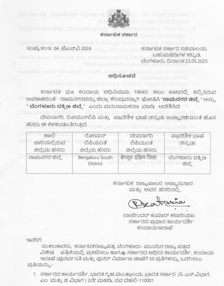 ಬೆಂಗಳೂರು (ಮೇ 23): ರಾಜ್ಯ ಸರ್ಕಾರವು ಮಹತ್ವದ ಹೆಜ್ಜೆಯೊಂದನ್ನು ಇಟ್ಟಿದ್ದು, ಇಂದಿನಿಂದ ರಾಮನಗರ ಜಿಲ್ಲೆಯ ಹೊಸ ಹೆಸರು ಬೆಂಗಳೂರು ದಕ್ಷಿಣ ಜಿಲ್ಲೆ ಎಂದು ಅಧಿಕೃತವಾಗಿ ಘೋಷಣೆ ಮಾಡಲಾಗಿದೆ. ಈ ಸಂಬಂಧ ರಾಜ್ಯ ಸರ್ಕಾರವು ಅಧಿಕೃತ ಅಧಿಸೂಚನೆ ಹೊರಡಿಸಿದ್ದು, ಈ ಹೆಸರು ನಿನ್ನೆ ಮಧ್ಯರಾತ್ರಿಯಿಂದಲೇ ಜಾರಿಗೆ ಬರುವಂತೆ ಕ್ರಮ ಕೈಗೊಂಡಿದೆ.