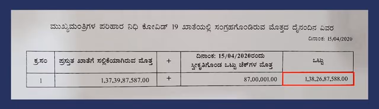 ಮಾರ್ಚ್ 27 ರಿಂದ ಏಪ್ರಿಲ್ 15ರ ವರೆಗೆ ಒಟ್ಟು 138,26,87,588 ರೂಪಾಯಿ ದೇಣಿಗೆ ಮುಖ್ಯಮಂತ್ರಿ ಪರಿಹಾರ ನಿಧಿಯ ಖಾತೆಗೆ ಜಮೆಯಾಗಿದೆ.