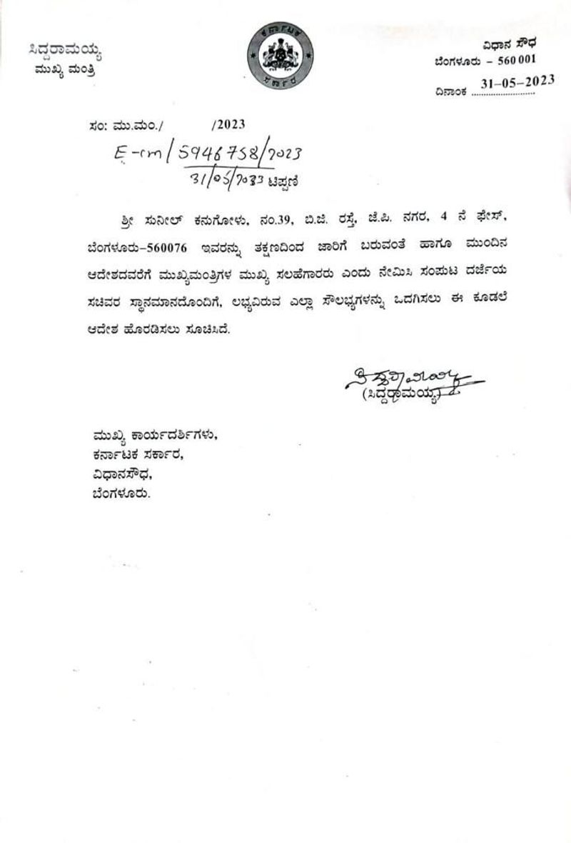 ಸುನೀಲ್ ಕನುಗೋಲು ಅವರನ್ನು ತಕ್ಷಣದಿಂದ ಜಾರಿಗೆ ಬರುವಂತೆ ಹಾಗೂ ಮುಂದಿನ ಆದೇಶದವರೆಗೆ ಮುಖ್ಯಮಂತ್ರಿಗಳ ಮುಖ್ಯ ಸಲಹೆಗಾರರು ಎಂದು ನೇಮಿಸಿ ಸಂಪುಟ ದರ್ಜೆಯ ಸಚಿವ ಸ್ಥಾನಮಾನದೊಂದಿಗೆ, ಲಬ್ಯವಿರುವ ಎಲ್ಲ ಸೌಲಬ್ಯಗಳನ್ನು ಒದಗಿಸಲು ಈ ಕೂಡಲೇ ಆದೇಶ ಹೊರಡಿಸಲು ಸೂಚಿಸಿದೆ ಅಂತ ಸಿಎಂ ಮುಖ್ಯ ಕಾರ್ಯದರ್ಶಿಗಳು ತಮ್ಮ ಆದೇಶದಲ್ಲಿ ತಿಳಿಸಿದ್ದಾರೆ.