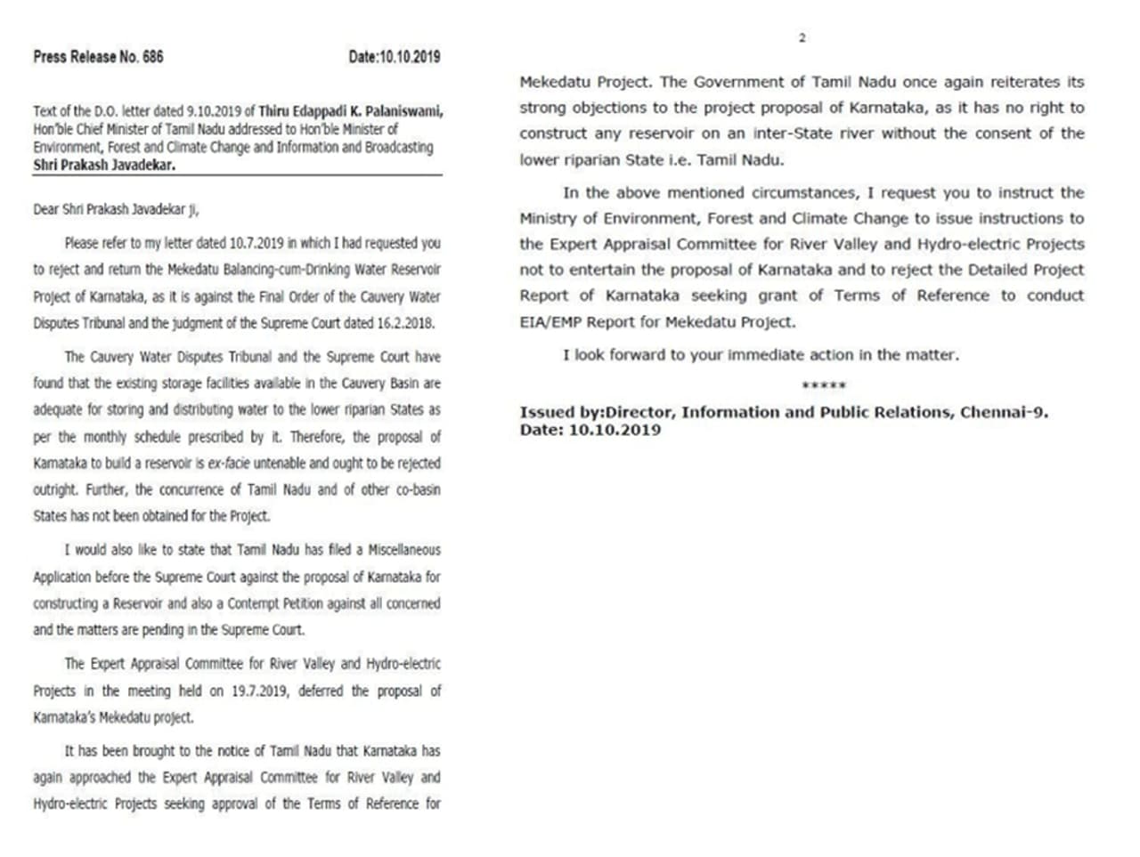 ಮೇಕೆದಾಟು ಯೋಜನೆ ಕಾವೇರಿ ನ್ಯಾಯಾಧೀಕರಣ ಮತ್ತು ಸುಪ್ರೀಂಕೋರ್ಟ್ ನೀಡಿದ ತೀರ್ಪಿನ ಉಲ್ಲಂಘನೆಯಾಗಲಿದೆ ಎಂದು ಪತ್ರದಲ್ಲಿ ತಿಳಿಸಿದ್ದಾರೆ. ಕೇರಳ ಸರ್ಕಾರ ಸಹ ಯೋಜನೆಗೆ ವಿರೋಧ ವ್ಯಕ್ತಪಡಿಸಿದೆ ಎಂದು ತಮಿಳುನಾಡು ಸಿಎಂ ಕೆ. ಪಳನಿಸ್ವಾಮಿ ಅವರು ಪ್ರಕಾಶ್ ಜಾವಡೇಕರ್ ಅವರಿಗೆ ಪತ್ರ ಬರೆದಿದ್ದಾರೆ.