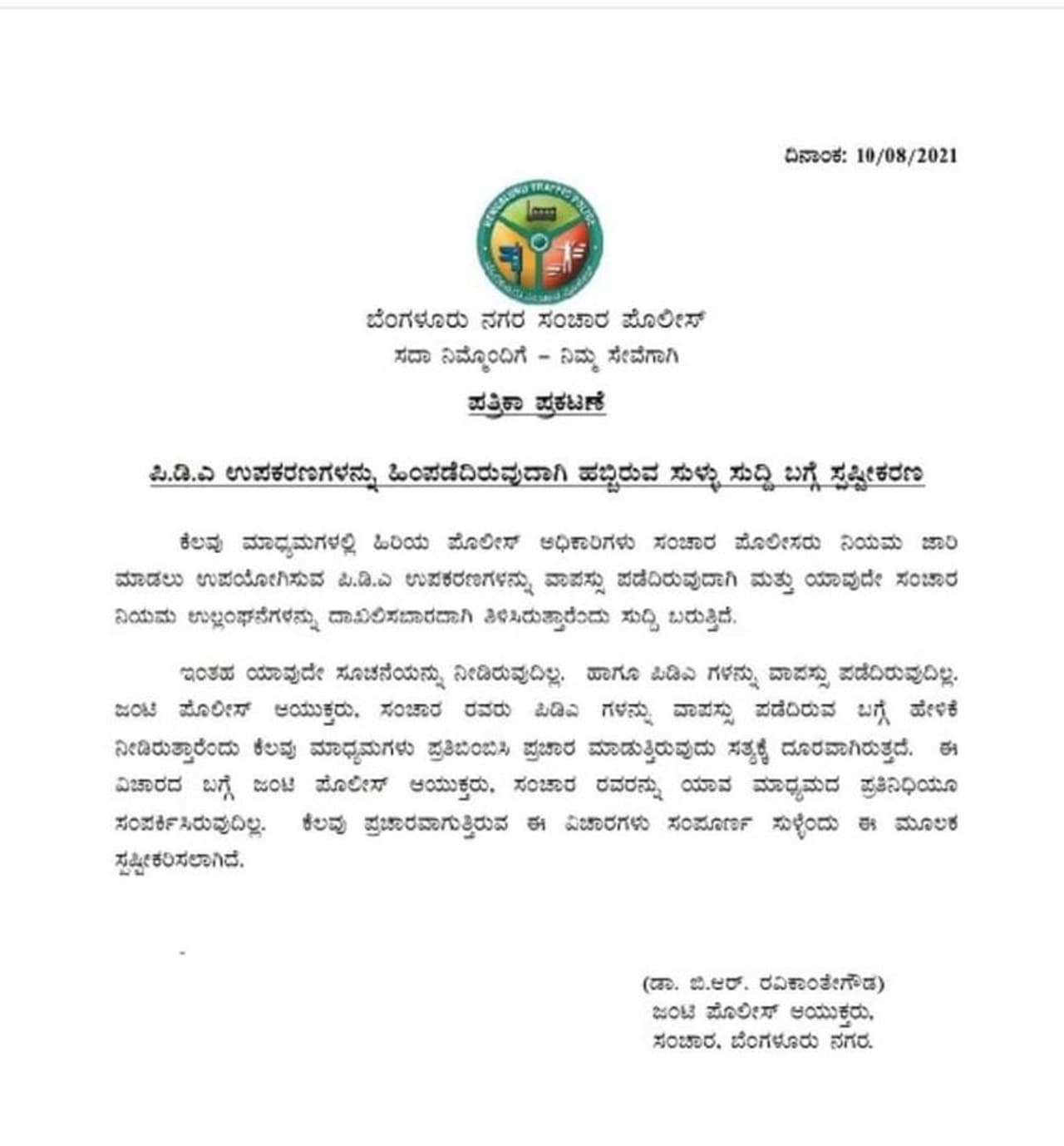 ಈ ಕುರಿತು ಪತ್ರಿಕಾ ಪ್ರಕಟಣೆ ಹೊರಡಿಸಿದ್ದು, "ಸಂಚಾರ ನಿಯಮಗಳನ್ನು ಜಾರಿಗೊಳಿಸಲು ಉಪಯೋಗಿಸುವ ಪಿ.ಡಿ.ಎ ಯಂತ್ರಗಳನ್ನು ಕೆಲವು ಹಿರಿಯ ಪೊಲೀಸ್ ಅಧಿಕಾರಿಗಳು ಸಂಚಾರ ಪೊಲೀಸರಿಂದ ವಾಪಸು ಪಡೆದಿದ್ದಾರೆ. ಸಂಚಾರ ನಿಯಮ ಉಲ್ಲಂಘನೆ ಮಾಡಿದವರ ಮೇಲೆ ಯಾವುದೇ ಪ್ರಕರಣ ದಾಖಲಿಸದಂತೆ ಹಿರಿಯ ಅಧಿಕಾರಿಗಳು ಆದೇಶ ಮಾಡಿದ್ದಾರೆ ಎಂಬುದರ ಬಗ್ಗೆ ಹಲವು ಸುದ್ದಿ ಮಾಧ್ಯಮಗಳು ಸುದ್ದಿ ಪ್ರಕಟಿಸಿವೆ ಎಂದು ಸ್ಪಷ್ಟಡಿಸಿದ್ದಾರೆ.