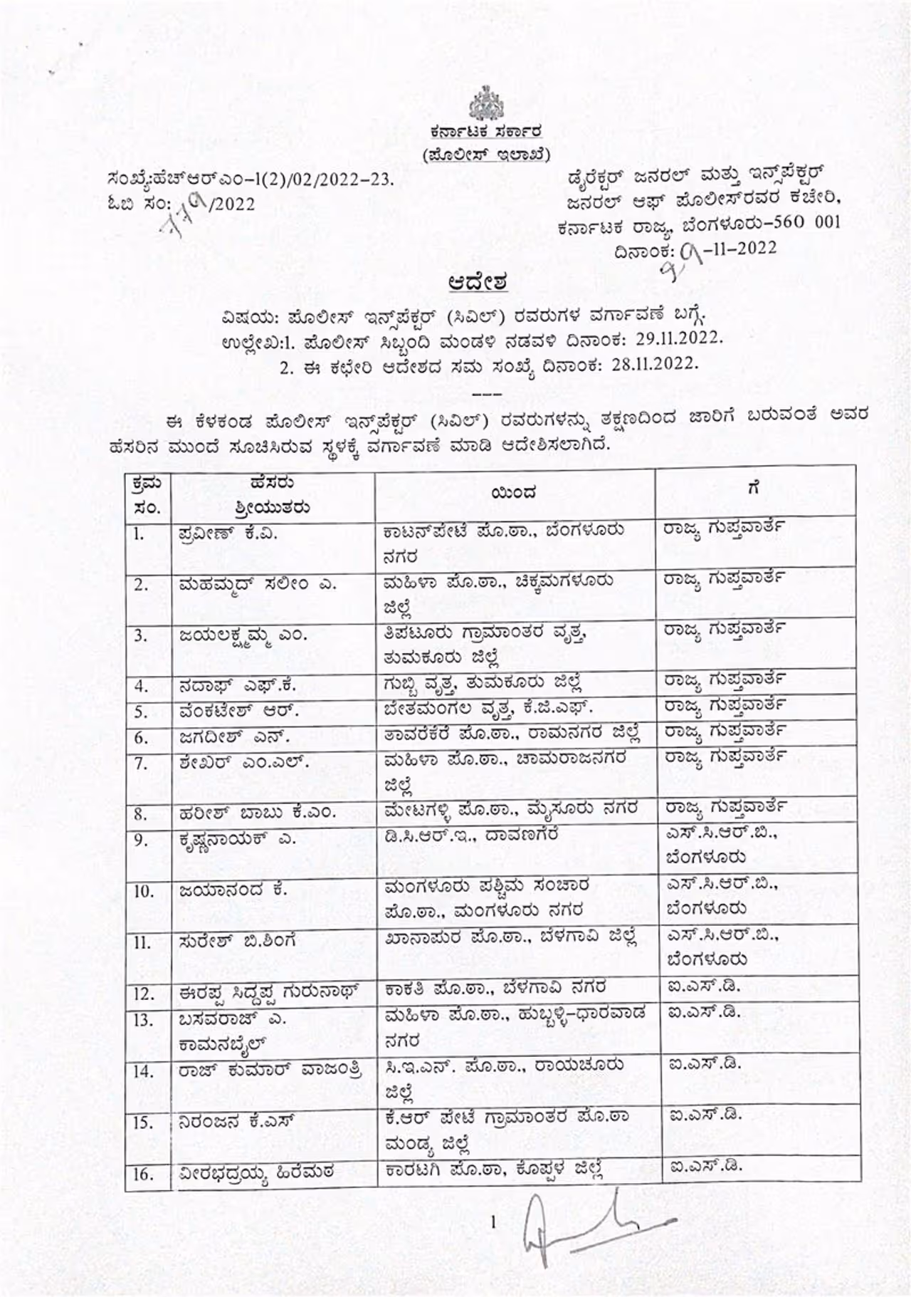 ರಾಜ್ಯ ಪೊಲೀಸ್ ಇಲಾಖೆಯಲ್ಲಿ ಮಂಗಳವಾರ ಮತ್ತೆ ಸರಕಾರ ಮೇಜರ್ ಸರ್ಜರಿ ಮಾಡಿದೆ. ಒಟ್ಟು 30 ಇನ್ಸ್ಪೆಕ್ಟರ್ಗಳನ್ನು ಸರ್ಕಾರ ವರ್ಗಾವಣೆ ಮಾಡಿ ಆದೇಶವನ್ನು ಹೊರಡಿಸಿದೆ.