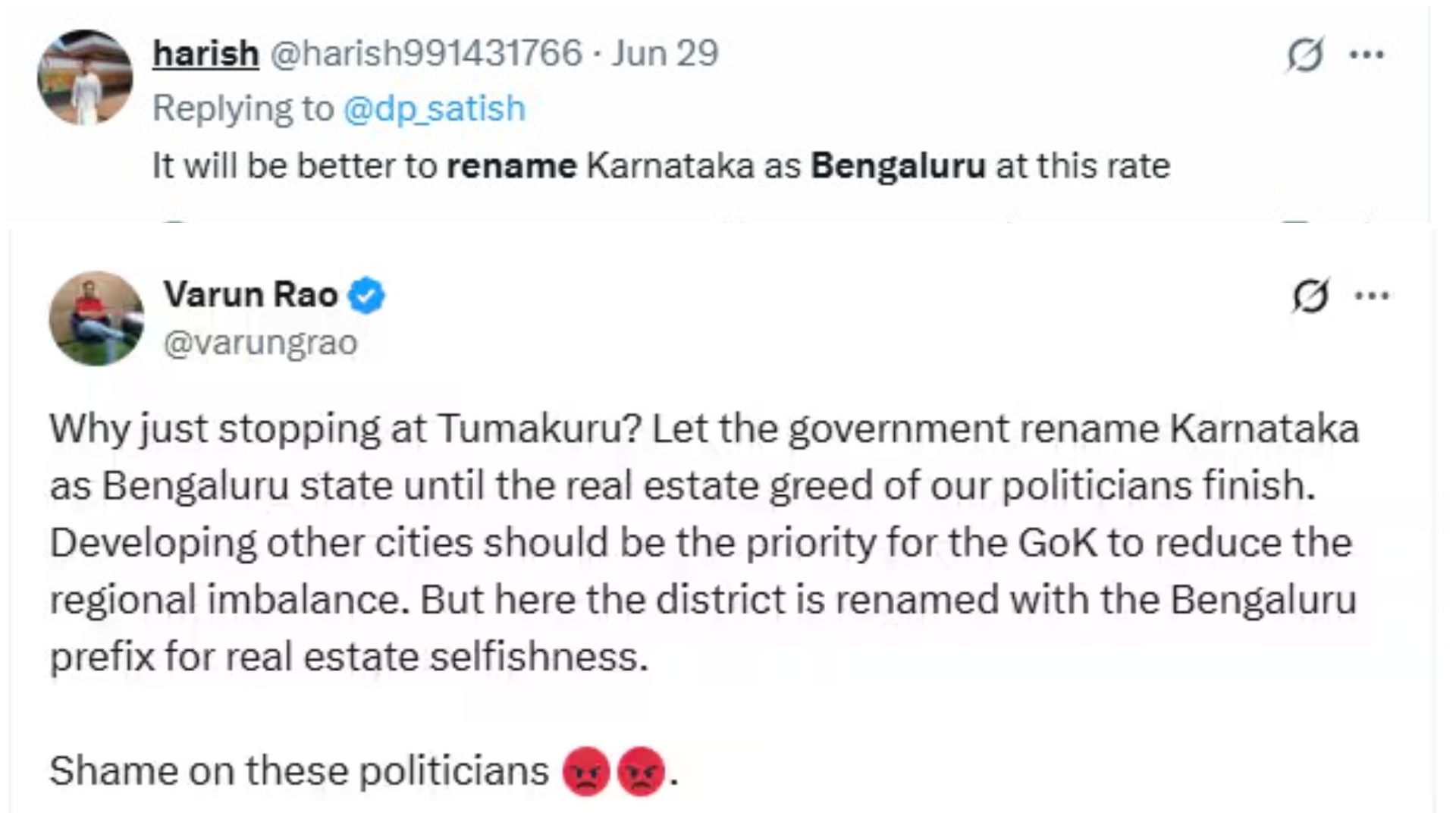 “ತುಮಕೂರಿನಲ್ಲಿ ಏಕೆ ನಿಲ್ಲಬೇಕು? ನಮ್ಮ ರಾಜಕಾರಣಿಗಳ ರಿಯಲ್ ಎಸ್ಟೇಟ್ ದುರಾಸೆ ತೃಪ್ತಿಯಾಗುವವರೆಗೆ ಕರ್ನಾಟಕವನ್ನೆಲ್ಲಾ ಬೆಂಗಳೂರು ರಾಜ್ಯ ಎಂದು ಮರುನಾಮಕರಣ ಮಾಡಿ.” ಎಂದು ಒಬ್ಬರು ಬರೆದಿದ್ದಾರೆ