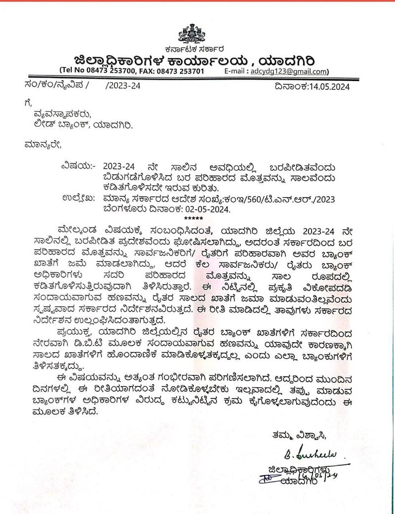 ಯಾದಗಿರಿ ಹಾಗೂ ಧಾರವಾಡ ಜಿಲ್ಲೆಯ ಕುಂದಗೋಳ ತಾಲೂಕಿನಲ್ಲಿ ಬರ ಪರಿಹಾರವನ್ನು ಬೆಳೆಸಾಲಕ್ಕೆ ಕಡಿತ ಮಾಡಿದ ಪ್ರಕರಣಗಳು ಬೆಳಕಿಗೆ ಬಂದಿದ್ದು, ರೈತರಿಂದ ತೀವ್ರ ಆಕ್ರೋಶ ವ್ಯಕ್ತವಾಗಿತ್ತು. ಈ ಕುರಿತು ಕನ್ನಡಪ್ರಭ ಬುಧವಾರ ವರದಿ ಪ್ರಕಟಿಸಿದ್ದು, ಇದರಿಂದ ಎಚ್ಚೆತ್ತುಕೊಂಡ ಜಿಲ್ಲಾಧಿಕಾರಿಗಳು ಇಂಥದ್ದೊಂದು ಕಟ್ಟುನಿಟ್ಟಿನ ಸೂಚನೆ ನೀಡಿದ್ದಾರೆ.