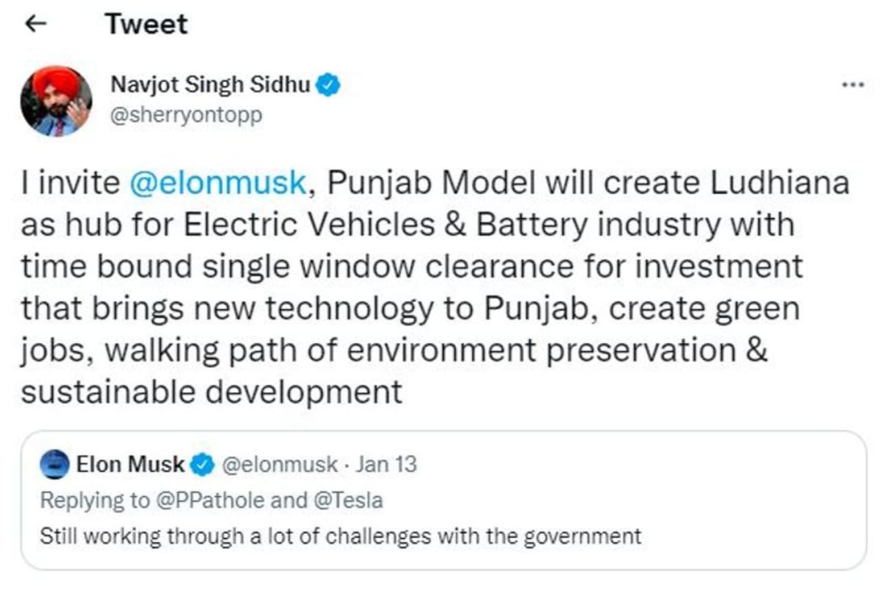 ಇನ್ನು ಪಶ್ಚಿಮ ಬಂಗಾಳ ಸಚಿವ ಎಂ.ಡಿ. ಘುಲಾಮ್ ರಬ್ಬಾನಿ ಸಹ, ‘ನಿಮ್ಮ ಸಂಸ್ಥೆಯನ್ನು ಬಂಗಾಳದಲ್ಲಿ ಸ್ಥಾಪಿಸಿ. ಮುಖ್ಯಮಂತ್ರಿ ಮಮತಾ ಬ್ಯಾನರ್ಜಿ ಅವರಿಗೆ ದೂರದೃಷ್ಟಿಇದೆ. ಬಂಗಾಳ ಎಂದರೆ ವ್ಯವಹಾರ’ ಎಂದು ಟ್ವೀಟ್ ಮಾಡಿದ್ದಾರೆ. ಪಂಜಾಬ್ ಕಾಂಗ್ರೆಸ್ನ ರಾಜ್ಯ ಘಟಕದ ಮುಖ್ಯಸ್ಥರಾಗಿರುವ ನವಜೋತ್ ಸಿಂಗ್ ಸಿಧು ಕೂಡ ಟೆಸ್ಲಾ ಸಿಇಒ ಎಲೋನ್ ಮಸ್ಕ್ಗೆ ಆಹ್ವಾನ ನೀಡಿದ್ದಾರೆ. "ಪಂಜಾಬ್ ಮಾದರಿ" ಅಡಿಯಲ್ಲಿ, ಲುಧಿಯಾನ ಎಲೆಕ್ಟ್ರಿಕ್ ವಾಹನ ಮತ್ತು ಬ್ಯಾಟರಿ ಉದ್ಯಮದ ಕೇಂದ್ರವಾಗಿ ಹೊರಹೊಮ್ಮಲಿದೆ ಎಂದು ಸಿಧು ಹೇಳಿದ್ದಾರೆ. ರಾಜ್ಯವು "ಹೊಸ ತಂತ್ರಜ್ಞಾನವನ್ನು ತರುವ ಹೂಡಿಕೆಗೆ ಟೈಮ್ ಬೌಂಡ್ ಸಿಂಗಲ್ ವಿಂಡೋ ಕ್ಲಿಯರೆನ್ಸ್" ನೀಡುತ್ತದೆ ಮತ್ತು "green jobs" ಸೃಷ್ಟಿಸುತ್ತದೆ, ಎಂದು ಸಿಧು ಹೇಳಿದ್ದಾರೆ. ಮುಂದಿನ ತಿಂಗಳು ವಿಧಾನಸಭಾ ಚುನಾವಣೆಯಲ್ಲಿ ಕಾಂಗ್ರೆಸ್ ಅಧಿಕಾರವನ್ನು ಉಳಿಸಿಕೊಂಡರೆ ಮುಖ್ಯಮಂತ್ರಿ ಹುದ್ದೆಗೆ ಸಿಧು ಪ್ರಮುಖ ಸ್ಪರ್ಧಿ ಎಂದು ಹೇಳಲಾಗುತ್ತಿದೆ.