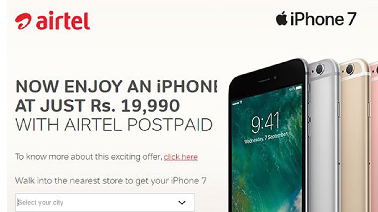 ಹೊಸ ಗ್ರಾಹಕರನ್ನು ಸೆಳೆಯಲು ಈ ಕೊಡುಗೆ ನೀಡಿದ್ದು, ಗ್ರಾಹಕರು 19,990 ನೀಡಿ ಐ ಪೋನ್ 7 ಖರೀದಿಸಿದರೆ, ಏರ್ಟೆಲ್ ಪೋಸ್ಟ್ ಪೇಡ್ ನೊಂದಿಗೆ 12 ತಿಂಗಳು ಉಳಿಯಬೇಕಿದೆ. ಸದ್ಯ ಈ ಕೊಡುಗೆ ನೋಯ್ಡಾ ಮತ್ತು ಕರ್ನಾಟಕದ ವಲಯದ ಗ್ರಾಹಕರಿಗೆ ಮಾತ್ರ ಲಭ್ಯವಿದೆ.