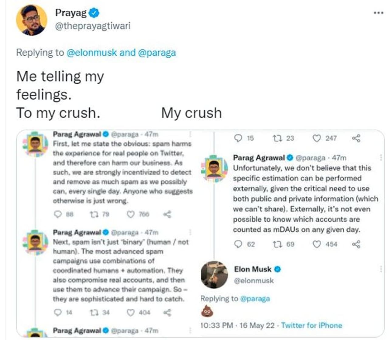 ಟ್ವಿಟ್ಟರನ್ನು ಖರೀದಿಸಲು ಸ್ಪ್ಯಾಮ್ ಖಾತೆಗಳ ಮೇಲಿನ ಮಾಹಿತಿಯ ಬಾಕಿ ಇರುವುದರಿಂದ, $44 ಶತಕೋಟಿ ಡಾಲರ್ ಒಪ್ಪಂದವನ್ನು "ತಾತ್ಕಾಲಿಕವಾಗಿ ತಡೆಹಿಡಿಯಲಾಗಿದೆ" ಎಂದು ಎಲಾನ್ ಮಸ್ಕ್ ಶುಕ್ರವಾರ ಹೇಳಿದ್ದರು. ಕಂಪನಿಯ ಕಾರ್ಯವಿಧಾನವನ್ನು ಸಮರ್ಥಿಸಿಕೊಂಡಿರುವ ಪರಾಗ್ ಅಗರ್ವಾಲ್ ಟ್ವೀಟ್ಗೆ ಟೆಸ್ಲಾ ಮಸ್ಕ್ ಈಗ ಪೂಪ್ ಎಮೋಜಿಯೊಂದಿಗೆ ಪ್ರತಿಕ್ರಿಯಿಸಿದ್ದಾರೆ.