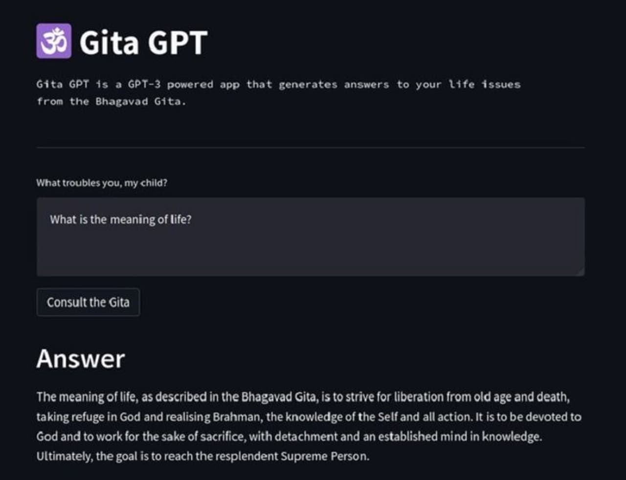 ಎಐ ಬಾಟ್ ಆಗಿರುವ ಇದನ್ನು ಗೀತಾ ಜಿಪಿಟಿ ಎನ್ನುವ ಹೆಸರಿನಿಂದ ಕರೆಯಲಾಗಿದೆ. ಇದು ಹಿಂದುಗಳ ಅತ್ಯಂತ ಪುರಾತನ ಧರ್ಮಗ್ರಂಥವಾದ ಭಗವದ್ಗೀತೆಯ ಜ್ಞಾನ ಹಾಗೂ ಆಧ್ಯಾತ್ಮವನ್ನು ಬಳಸಿಕೊಂಡು, ಜಿಟಪಿಯ ಬಳಕೆದಾರನ ಜೀವನದ ನಿರ್ಧಾರಗಳಿಗೆ ಮಾರ್ಗದರ್ಶನ ಹಾಗೂ ಸ್ಪಷ್ಟ ಜ್ಞಾನವನ್ನು ನೀಡುತ್ತದೆ. ಭಗವದ್ಗೀತೆಯ ಅಪಾರ ಜ್ಞಾನವನ್ನು ಬಳಸಿಕೊಳ್ಳುವ ಮೂಲಕ, ಗೀತಾ ಜಿಪಿಟಿ ಬಳಕೆದಾರರಿಗೆ ಒಂದು ಅನನ್ಯ ದೃಷ್ಟಿಕೋನವನ್ನು ಮತ್ತು ಅವರ ಪ್ರಶ್ನೆಗಳ ಬಗ್ಗೆ ಹೆಚ್ಚು ಆಳವಾದ ಜ್ಞಾನವನ್ನು ನೀಡುತ್ತದೆ. ಇದು ಜೀವನದ ಉದ್ದೇಶ, ನೈತಿಕ ಸಂದಿಗ್ಧತೆಗಳು ಅಥವಾ ಯಾವುದೇ ಇತರ ಅಸ್ತಿತ್ವವಾದದ ಪ್ರಶ್ನೆಯಾಗಿರಲಿ, ವ್ಯಕ್ತಿಗಳು ತಮ್ಮ ಜೀವನವನ್ನು ನ್ಯಾವಿಗೇಟ್ ಮಾಡಲು ಸಹಾಯ ಮಾಡಲು ಗೀತಾ ಜಿಪಿಟಿ ನಿಮಗೆ ಭಗವದ್ಗೀತೆಗೆ ಒಳನೋಟವುಳ್ಳ ಮತ್ತು ಅರ್ಥಪೂರ್ಣ ಉತ್ತರಗಳನ್ನು ನೀಡುತ್ತದೆ.