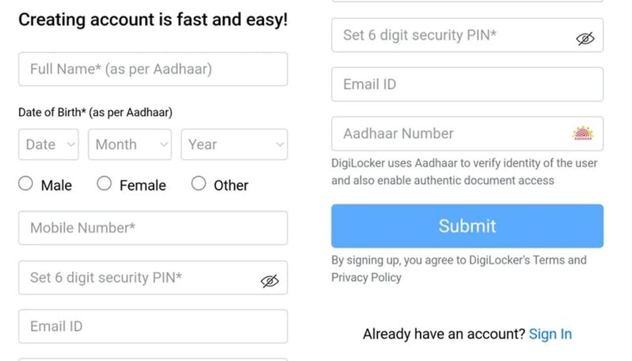 - ಖಾತೆ ರಚನೆ ಪುಟದಲ್ಲಿ, ನೀವು ಮಾಹಿತಿ ನೀಡಬೇಕಾದ ಬಹಳಷ್ಟು ಕಾಲಮ್ಗಳಿವೆ. ಇವುಗಳು ನಿಮ್ಮ ಪೂರ್ಣ ಹೆಸರು, ಹುಟ್ಟಿದ ದಿನಾಂಕ, ಲಿಂಗ ಮತ್ತು ನಿಮ್ಮ ಆಧಾರ್ ಸಂಖ್ಯೆಯಂತಹ ಅಂಶಗಳನ್ನು ಒಳಗೊಂಡಿರುತ್ತದೆ. ಒಮ್ಮೆ ಈ ಎಲ್ಲ ಮಾಹಿತಿ ತುಂಬಿದ ನಂತರ, ಅಪ್ಲಿಕೇಶನ್ ಫೋನ್ ಸಂಖ್ಯೆಗೆ ಓಟಿಪಿಯನ್ನು (OTP) ಕಳುಹಿಸುತ್ತದೆ ಅದನ್ನು ನೀವು ಮೌಲ್ಯೀಕರಿಸಲು ನಮೂದಿಸಬೇಕು.