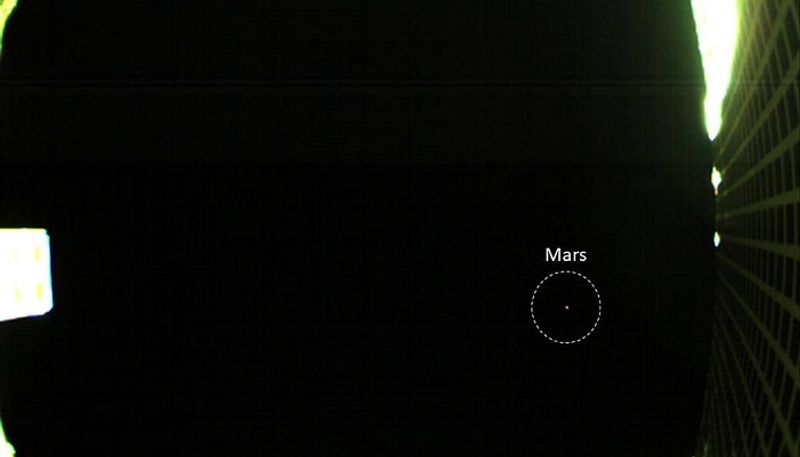 ಕಳೆದ ಅಕ್ಟೋಬರ್ 3 ರಂದು ಈ ಫೋಟೋ ಕ್ಲಿಕ್ಕಿಸಲಾಗಿದ್ದು, ಕೆಂಪು ಬಣ್ಣದ ಮಂಗಳ ಗ್ರಹ ಅತ್ಯಂತ ಸ್ಪಷ್ಟವಾಗಿ ಕಾಣಬಹುದಾಗಿದೆ. ಈಗಾಗಲೇ 399 ಮಿಲಿಯನ್ ಕಿ.ಮೀ. ಕ್ರಮಿಸಿರುವ ಕ್ಯೂಬ್ ಸ್ಯಾಟ್ ಯಂತ್ರ ಮಂಗಳ ಗ್ರಹ ಸೂರ್ಯನನ್ನು ಸುತ್ತು ಹೊಡೆಯುವ ಅಕ್ಷಾಂಶದಲ್ಲೇ ಗ್ರಹವನ್ನು ಹಿಂಬಾಲಿಸಲಿದೆ.