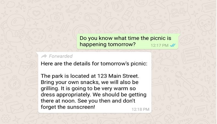 ವಾಟ್ಸಪ್ನಲ್ಲಿ ಬರುವ ಮೆಸೆಜ್ ಮೇಲೆ ಒಂದು ವೇಳೆ ನಿರ್ದಿಷ್ಟ ಸಂದೇಶವೊಂದು ಫಾರ್ವರ್ಡ್ ಮಾಡಿದ್ದಾಗಿದ್ದರೆ ಮೆಸೆಜ್ ಮೇಲೆ ಫಾರ್ವರ್ಡ್ ಐಕಾನ್ ಕಾಣಿಸುತ್ತದೆ. ಈ ಮೂಲಕ ಸಂದೇಶದ ಮೂಲವನ್ನು ತುಂಬ ಸರಳವಾಗಿ ಪತ್ತೆ ಮಾಡಬಹುದಾಗಿದೆ.