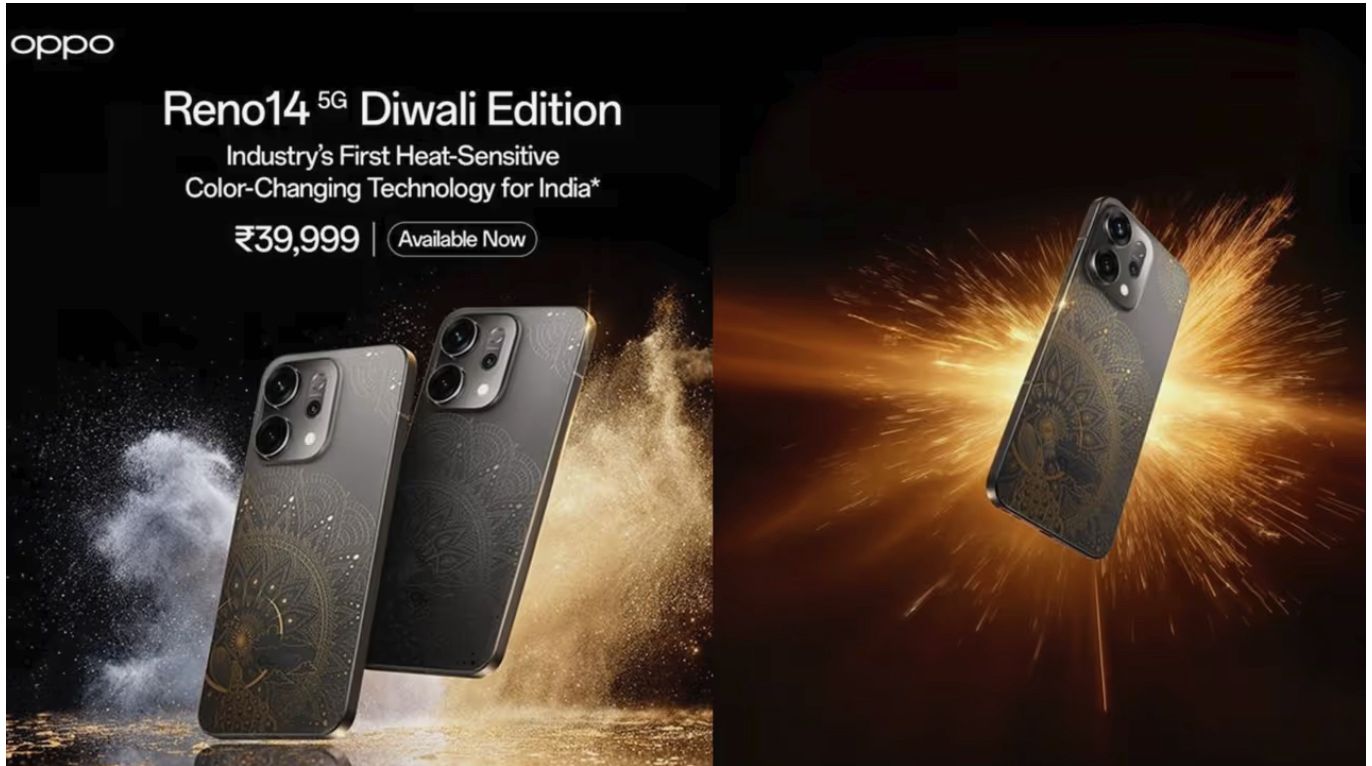 OPPO Reno14 5G Diwali Edition Launched ದೀಪಾವಳಿಗಾಗಿ ವಿಶೇಷವಾಗಿ ವಿನ್ಯಾಸಗೊಳಿಸಲಾದ OPPO Reno14 5G ದೀಪಾವಳಿ ಎಡಿಷನ್, ಉದ್ಯಮದಲ್ಲೇ ಮೊದಲ ಬಾರಿಗೆ ಹೀಟ್-ಸೆನ್ಸಿಟಿವ್, ಬಣ್ಣ ಬದಲಾಯಿಸುವ ತಂತ್ರಜ್ಞಾನವನ್ನು ಹೊಂದಿದೆ.