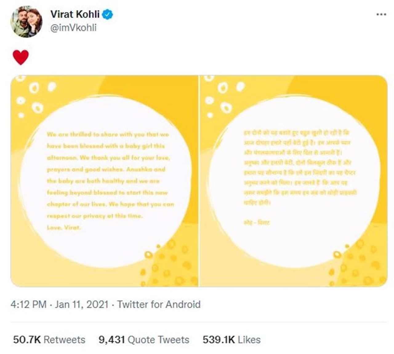 ಭಾರತೀಯ ಕ್ರಿಕೆಟಿಗ ವಿರಾಟ್ ಕೊಹ್ಲಿ ಈ ವರ್ಷ ತಮ್ಮ ಮಗಳ ಜನನವನ್ನು ಘೋಷಿಸಲು ಟ್ವಿಟರ್ ಬಳಸಿದ್ದರು. ಆ ಟ್ವೀಟ್ ಇದುವರೆಗೆ 538,200 ಲೈಕ್ಗಳೊಂದಿಗೆ ವರ್ಷದ ಅತಿ ಹೆಚ್ಚು ಲೈಕ್ ಪಡೆದ ಟ್ವೀಟ್ ಆಗಿದೆ. ಜನವರಿ 11 2021 ರಂದು ಕೊಹ್ಲಿ ಈ ಬಗ್ಗೆ ಟ್ವೀಟ್ ಮಾಡಿದ್ದರು. ಕುತೂಹಲಕಾರಿಯಾಗಿ, ಕಳೆದ ವರ್ಷ ಕೊಹ್ಲಿ ಅವರ ಪತ್ನಿ ಅನುಷ್ಕಾ ಶರ್ಮಾ ಅವರ ಗರ್ಭಧಾರಣೆಯನ್ನು ಘೋಷಿಸಿದ ಟ್ವೀಟ್ 2020 ರಲ್ಲಿ ಅತಿ ಹೆಚ್ಚು ಲೈಕ ಪಡೆದಿದ್ದ ಟ್ವೀಟ್ ಆಗಿತ್ತು.