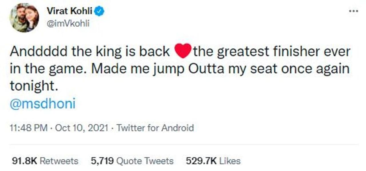 ಇಂಡಿಯನ್ ಪ್ರೀಮಿಯರ್ ಲೀಗ್ನಲ್ಲಿ ಎಂಎಸ್ ಧೋನಿ ಅವರ ಮ್ಯಾಚ್ ವಿನ್ನಿಂಗ್ ಆಟಕ್ಕಾಗಿ ವಿರಾಟ್ ಕೊಹ್ಲಿ ಮಾಡಿದ ಟ್ವೀಟ್ ಈ ವರ್ಷ ಕ್ರೀಡೆಯಲ್ಲಿ ಅತಿ ಹೆಚ್ಚು ರೀಟ್ವೀಟ್ ಮತ್ತು ಲೈಕ್ ಪಡೆದ ಟ್ವೀಟ್ ಆಗಿದೆ. ಇದು ಇಲ್ಲಿಯವರೆಗೆ 91,600 ಕ್ಕೂ ಹೆಚ್ಚು ರಿಟ್ವೀಟ್ಗಳನ್ನು ಮತ್ತು 529,500 ಲೈಕ್ಗಳನ್ನು ಸೆರೆಹಿಡಿದಿದೆ.