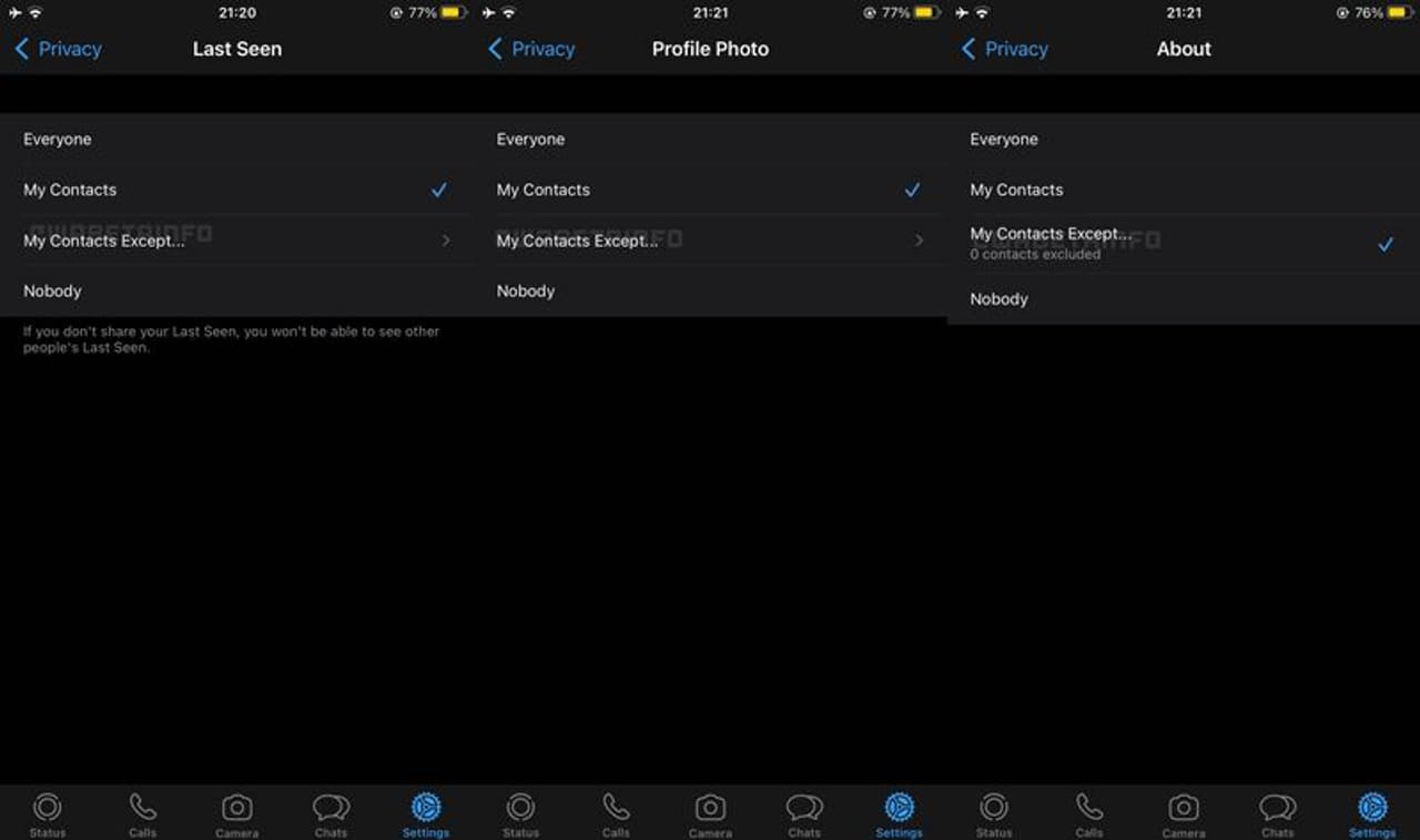 ಈ ಮೊದಲು ಬಳಕೆದಾರರಿಗೆ ಕೇವಲ ಮೂರು ಆಯ್ಕೆಗಳನ್ನು ಮಾತ್ರ ನೀಡಲಾಗಿತ್ತು: Everyone, My contact ಮತ್ತು Nobody. ಅದರೆ ಹೊಸ ನವೀಕರಣವು "ನMy Contacts except" ಹೊಸ ಆಯ್ಕೆಯನ್ನು ನೀಡುತ್ತದೆ. ಇದು ಬಳಕೆದಾರರಿಗೆ ಕಾಂಟ್ಯಾಕ್ಟ್ ಪಟ್ಟಿಗೆ ಸೇರಿಸಲು ಅನುಮತಿಸುತ್ತದೆ. ಈ ಪಟ್ಟಿಗೆ ಸೇರಿಸಲಾದ ಸಂಪರ್ಕಗಳಿಗೆ ಬಳಕೆದಾರರ ಲಾಸ್ಟ್ ಸೀನ್ ವೀಕ್ಷಿಸಲು ಸಾಧ್ಯವಾಗುವುದಿಲ್ಲ.