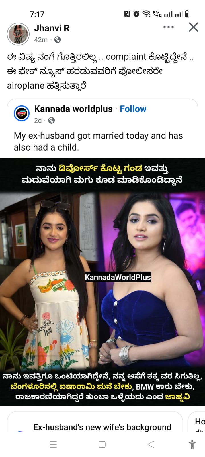 “ನಾನು ಡಿವೋರ್ಸ್ ಕೊಟ್ಟ ಗಂಡ ಇವತ್ತು ಮದುವೆಯಾಗಿ ಮಗು ಮಾಡಿಕೊಂಡಿದ್ದಾನೆ. ನಾವು ಇವತ್ತಿಗೂ ಒಂಟಿಯಾಗಿದ್ದೇನೆ, ನನ್ನ ಆಸೆಗೆ ತಕ್ಕ ವರ ಸಿಗುತ್ತಿಲ್ಲ. ಬೆಂಗಳೂರಿನಲ್ಲಿ ಐಷಾರಾಮಿ ಮನೆ ಬೇಕು, ಬಿಎಂಡಬ್ಲ್ಯೂ ಕಾರ್ ಬೇಕು, ರಾಜಕಾರಣಿಯಾಗಿದ್ದರೆ ತುಂಬ ಒಳ್ಳೆಯದು” ಎಂದು ಜಾನ್ವಿ ಹೇಳಿದ್ದಾರೆ ಎಂಬ ಪೋಸ್ಟ್ ಸೋಶಿಯಲ್ ಮೀಡಿಯಾದಲ್ಲಿ ವೈರಲ್ ಆಗ್ತಿದೆ. ಈ ಪೋಸ್ಟ್ ಜಾನ್ವಿ ಗಮನಕ್ಕೆ ಬಂದಿದ್ದು, ಅವರೀಗ ದೂರು ನೀಡಿರುವ ವಿಚಾರವನ್ನು ಸೋಶಿಯಲ್ ಮೀಡಿಯಾ ಪೋಸ್ಟ್ ಮೂಲಕ ಹೇಳಿಕೊಂಡಿದ್ದಾರೆ.