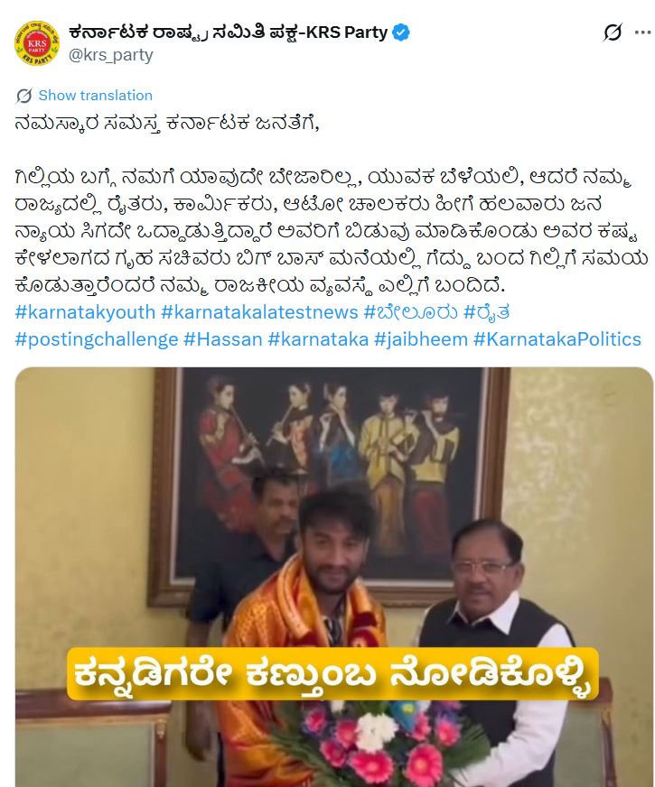 ಆದರೆ, ಬಿಗ್ ಬಾಸ್ನಲ್ಲಿ ಪ್ರತಿಸ್ಪರ್ಧಿಯಾಗಿದ್ದ ಅಶ್ವಿನಿ ಗೌಡ, ಧ್ರುವಂತ್ ಸೇರಿದಂತೆ ಹಲವರು ಗಿಲ್ಲಿಯ ಗೆಲುವಿಗೆ ಖುಷಿಯಾಗಿದ್ದರೂ ಬೇರೆ ಕೆಲವು ಸಂಗತಿಗಳನ್ನು ಇಟ್ಟುಕೊಂಡು ಗಮನ ಸೆಳೆದಿದ್ದಾರೆ, ಈಗ ಈ ಸಾಲಿಗೆ 'ಕರ್ನಾಟಕ ರಾಷ್ಟ್ರ ಸಮಿತಿ ಪಕ್ಷ' ಸಹ ಸೇರಿಕೊಂಡಿದೆ. ಹೌದು, ಗಿಲ್ಲಿಯ ಗೆಲುವಿನ ಸಂಗತಿಗಿಂತ ಹೆಚ್ಚಾಗಿ ಯೋಚಿಸಬೇಕಾದ ಸಂಗತಿಗಳು ಬೇಕಾದಷ್ಟಿವೆ ಎಂದು ಅಭಿಪ್ರಾಯ ಪಟ್ಟು ಕರ್ನಾಟಕ ರಾಷ್ಟ್ರ ಸಮಿತಿ ಪಕ್ಷ ಪೋಸ್ಟ್ ಮಾಡಿದೆ.