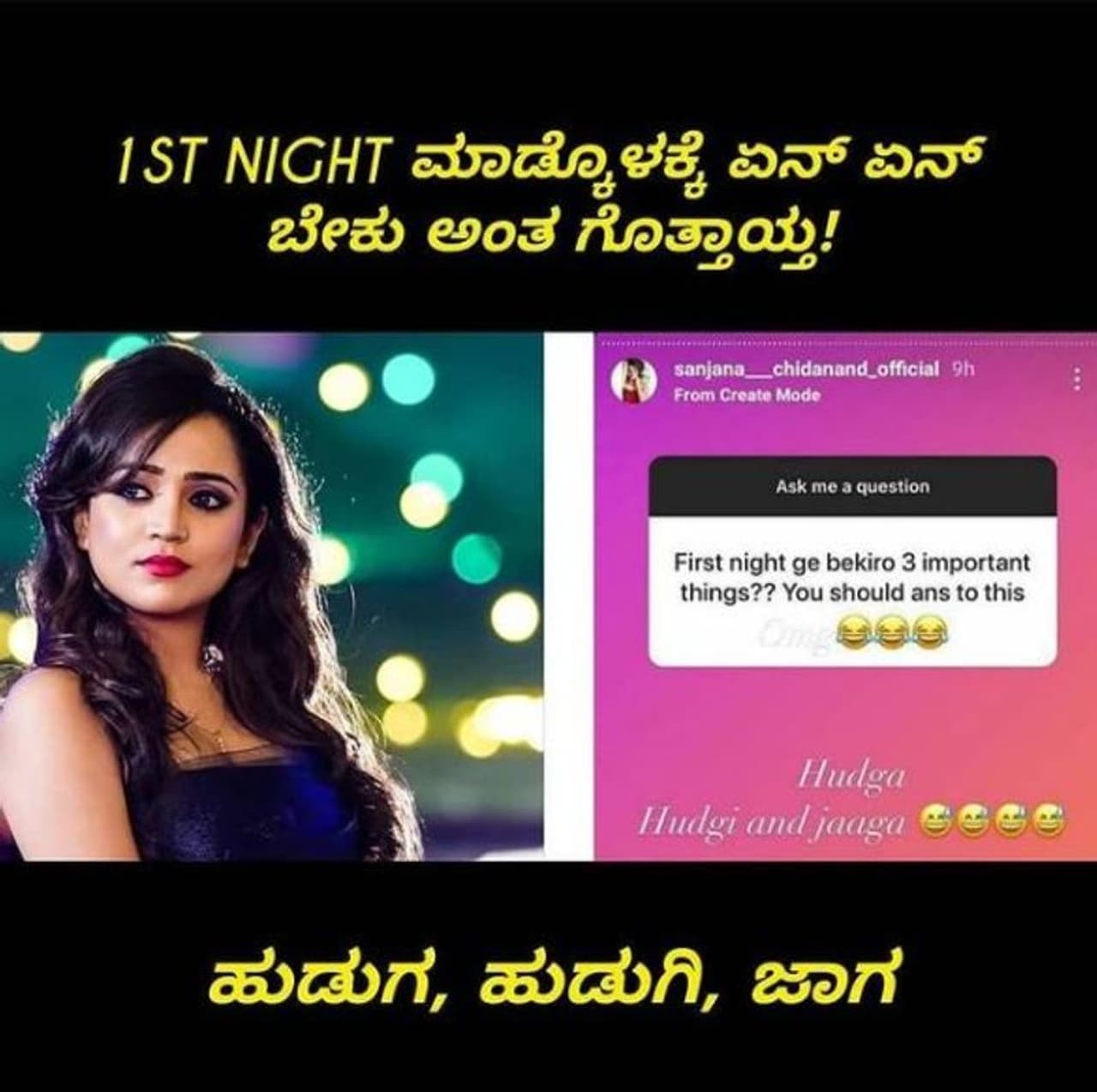 'ಫಸ್ಟ್ ನೈಟ್ಗೆ ಬೇಕಿರೋ 3 ಮುಖ್ಯವಾದ ವಸ್ತುಗಳು ಏನು? ಈ ಇದಕ್ಕೆ ಉತ್ತರ ಕೊಡಿ...' ಎಂದು ಪ್ರಶ್ನೆ ಕೇಳಿದ್ದಾರೆ. ' ಹುಡುಗ, ಹುಡುಗಿ ಮತ್ತೆ ಜಾಗ ಸಾಕು' ಎಂದು ಸಂಜನಾ ಉತ್ತರ ನೀಡಿದ್ದಾರೆ. ಈ ಸ್ಟೋರಿಯ ಸ್ಕ್ರೀನ್ ಶಾಟ್ ತೆಗೆದುಕೊಂಡು ಎಲ್ಲಾ ಟ್ರೋಲ್ ಪೇಜ್ಗಳಲ್ಲಿಯೂ ಪೋಸ್ಟ್ ಮಾಡಲಾಗುತ್ತಿದೆ.