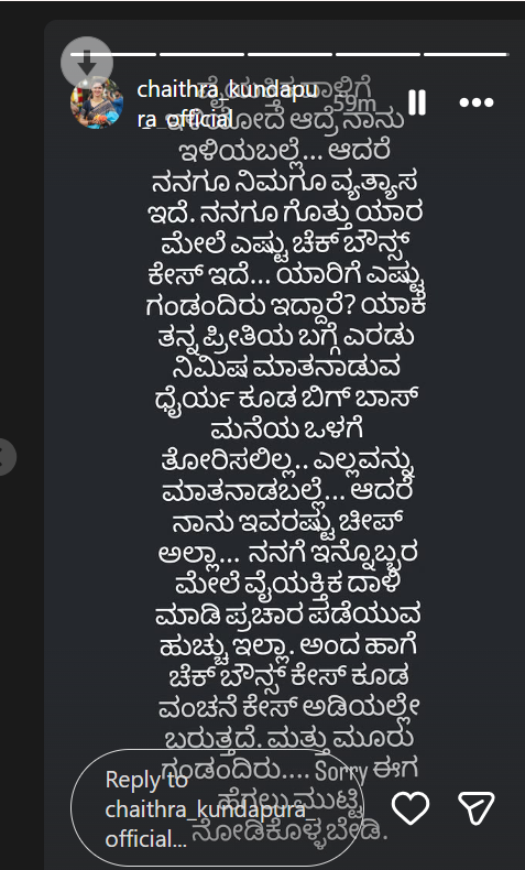 “ವೈಯಕ್ತಿಕ ದಾಳಿಗೆ ಇಳಿಯೋದೆ ಆದರೆ ನಾನು ಇಳಿಯಬಲ್ಲೆ. ಆದರೆ ನನಗೂ ನಿಮಗೂ ವ್ಯತ್ಯಾಸ ಇದೆ. ನನಗೂ ಗೊತ್ತು, ಯಾರು ಮೇಲೆ ಎಷ್ಟು ಚೆಕ್ಬೌನ್ಸ್ ಕೇಸ್ಇದೆ, ಯಾರಿಗೆ ಎಷ್ಟು ಗಂಡಂದಿರು ಇದ್ದಾರೆ? ಯಾಕೆ ತನ್ನ ಪ್ರೀತಿಯ ಬಗ್ಗೆ ಎರಡು ನಿಮಿಷ ಮಾತನಾಡುವ ಧೈರ್ಯ ಕೂಡ ಬಗ್ ಬಾಸ್ ಮನೆಯ ಒಳಗಡೆ ತೋರಿಸಲಿಲ್ಲ. ಎಲ್ಲವನ್ನು ಮಾತನಾಡಬಲ್ಲೆ, ಆದರೆ ನಾನು ಇವರಷ್ಟು ಚೀಪ್ಅಲ್ಲ, ನನಗೆ ಇನ್ನೊಬ್ಬತ ಮೇಲೆ ವೈಯಕ್ತಿಕ ದಾಳಿ ಮಾಡಿ ಪ್ರಚಾರ ಪಡೆಯುವ ಹುಚ್ಚು ಇಲ್ಲ. ಅಂದಹಾಗೆ ಚೆಕ್ ಬೌನ್ಸ್ಕೇಸ್ ಕೂಡ ವಂಚನೆ ಕೇಸ್ ಅಡಿಯಲ್ಲೇ ಬರುತ್ತದೆ. ಮೂರು ಗಂಡಂದಿರು.. ಕ್ಷಮಿಸಿ ಈಗ ಹೆಗಲು ಮುಟ್ಟಿ ನೋಡಿಕೊಳ್ಳಬೇಕು” ಎಂದು ಚೈತ್ರಾ ಕುಂದಾಪುರ ಅವರು ಪೋಸ್ಟ್ ಹಾಕಿದ್ದಾರೆ. ಚೈತ್ರಾ ಕುಂದಾಪುರ ಅವರು ಯಾವ ಬಿಗ್ ಬಾಸ್ ಸ್ಪರ್ಧಿಗೆ ಹೇಳಿದ್ದಾರೆ ಎಂಬುದನ್ನು ಅವರೇ ಹೇಳಬೇಕಿದೆ.