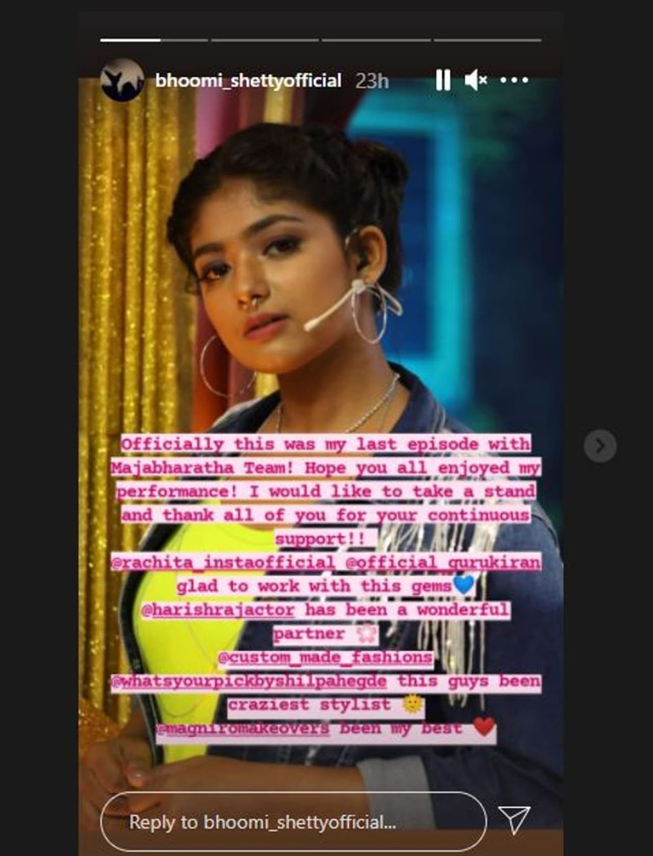 ಕಲರ್ಸ್ ಕನ್ನಡ ವಾಹಿನಿಯಲ್ಲಿ ಪ್ರಸಾರವಾಗುವ ಮಜಾ ಭಾರತ ಕಾಮಿಡಿ ಶೋನಿಂದ ಭೂಮಿ ಅಧಿಕೃತವಾಗಿ ಹೊರ ಬಂದಿರುವ ವಿಚಾರವನ್ನು ಸೋಷಿಯಲ್ ಮೀಡಿಯಾದಲ್ಲಿ ಬರೆದುಕೊಂಡಿದ್ದಾರೆ. 'ಇಂದು ನನ್ನ ಮಜಾ ಭಾರತ ಶೋನ ಕಡೆಯ ಶೋ. ನಾನು ಈ ಶೋ ನಿರೂಪಣೆ ನಿಲ್ಲಿಸುತ್ತಿದ್ದೇನೆ. ಅಧಿಕೃತ ಕಡೆ ಎಪಿಸೋಡ್ ಚಿತ್ರೀಕರಣ. ನೀವೆಲ್ಲರೂ ನನ್ನ ನಿರೂಪಣೆಯನ್ನು ಎಂಜಾಯ್ ಮಾಡಿದ್ದೀರಾ ಎಂದು ಭಾವಿಸಿರುವೆ. ನಾನೀಗೊಂದು ನಿಲುವು ತೆಗೆದುಕೊಂಡಿರುವೆ. ನೀವೆಲ್ಲರೂ ಇಷ್ಟು ದಿನಗಳ ಕಾಲ ಪ್ರೋತ್ಸಾಹ ನೀಡಿರುವುದಕ್ಕೆ ಧನ್ಯವಾದಗಳು. ರಚಿತಾ ರಾಮ್ ಹಾಗೂ ಗುರು ಕಿರಣ್ ಸರ್ ನೀವಿಬ್ಬರೂ ರತ್ನಗಳು. ಹರೀಶ್ ರಾಜ್ ನನ್ನಗೆ ಒಳ್ಳೆಯ ಪಾರ್ಟ್ನರ್ ಆಗಿದ್ದರು' ಎಂದು ಭೂಮಿ ಸ್ಟೋರಿ ಹಾಕಿದ್ದಾರೆ.