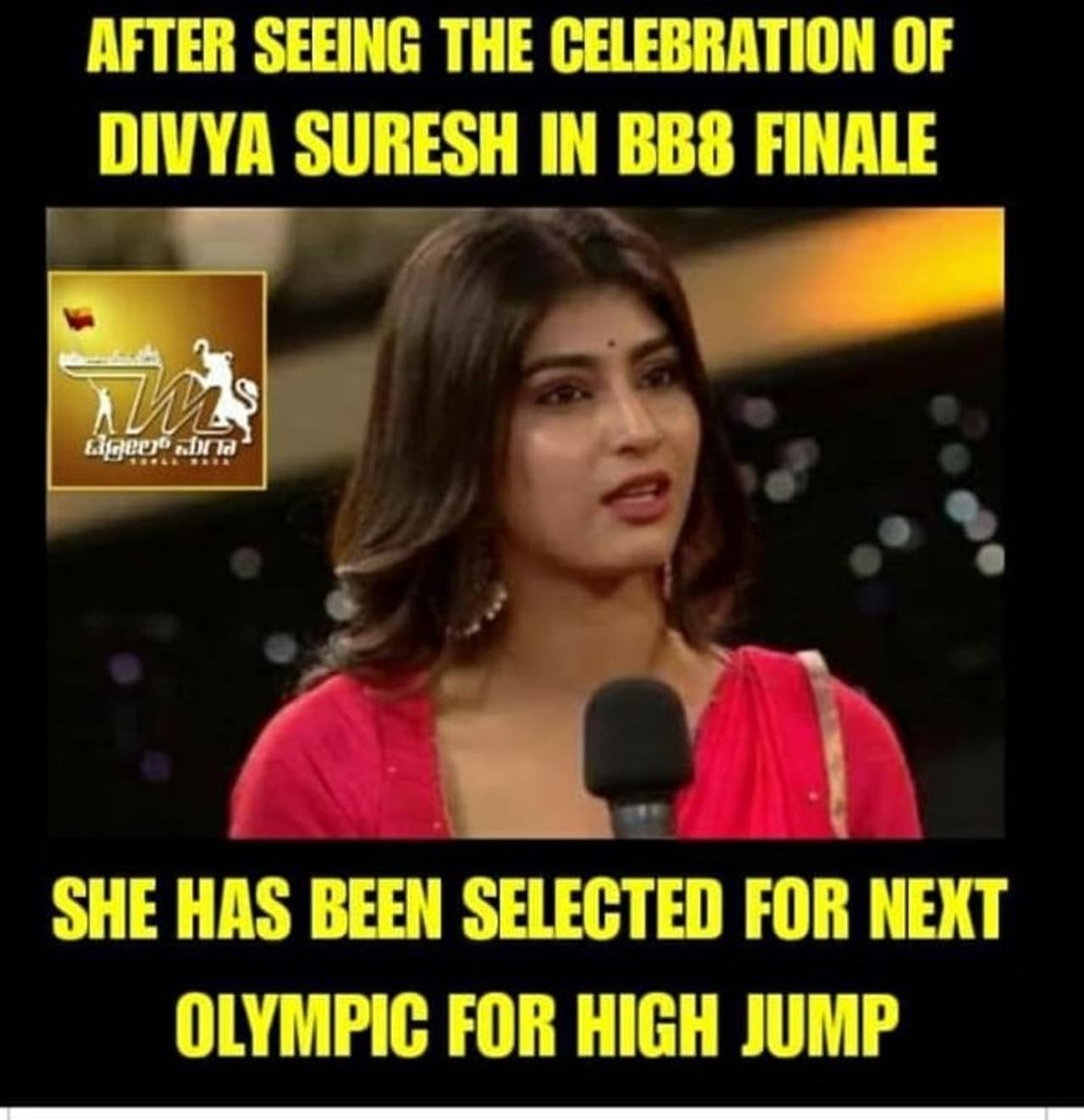 'ಬಿಗ್ಬಾಸ್ ಸೀಸನ್ 8ರ ಫಿನಾಲೆಯಲ್ಲಿ ದಿವ್ಯಾ ಸುರೇಶ್ ಅವರ ಸಂಭ್ರಮನಾಚರಣೆಯನ್ನು ನೋಡಿದ ಮೇಲೆ ಅವರನ್ನು ಮುಂದಿನ ಒಲಿಂಪಿಕ್ಸ್ನಲ್ಲಿ ಹೈಜಂಪ್ಗೆ ಆಯ್ಕೆ ಮಾಡಲಾಗಿದೆ' ಎಂದು ಬರೆದಿರುವ ಟ್ರೋಲ್ಗಳು ಸದ್ದು ಮಾಡುತ್ತಿದೆ. ಕುಳಿತಿದ್ದಲ್ಲಿಂದಲೇ ಕುಣಿದು ಕುಪ್ಪಳಿಸಿದ ದಿವ್ಯಾ ಸುರೇಶ್ ನೋಡಿದರೆ ಇದ್ಯಾಕೋ ಓವರ್ ಆಯ್ತು ಎಂದೆನಿಸಿದರೂ ಅವರ ಗೆಳೆದ ಗೆದ್ದಿರುವ ಖುಷಿ ಅವರ ಮುಖದಲ್ಲಿ ಎದ್ದು ಕಾಣುತ್ತಿತ್ತು.