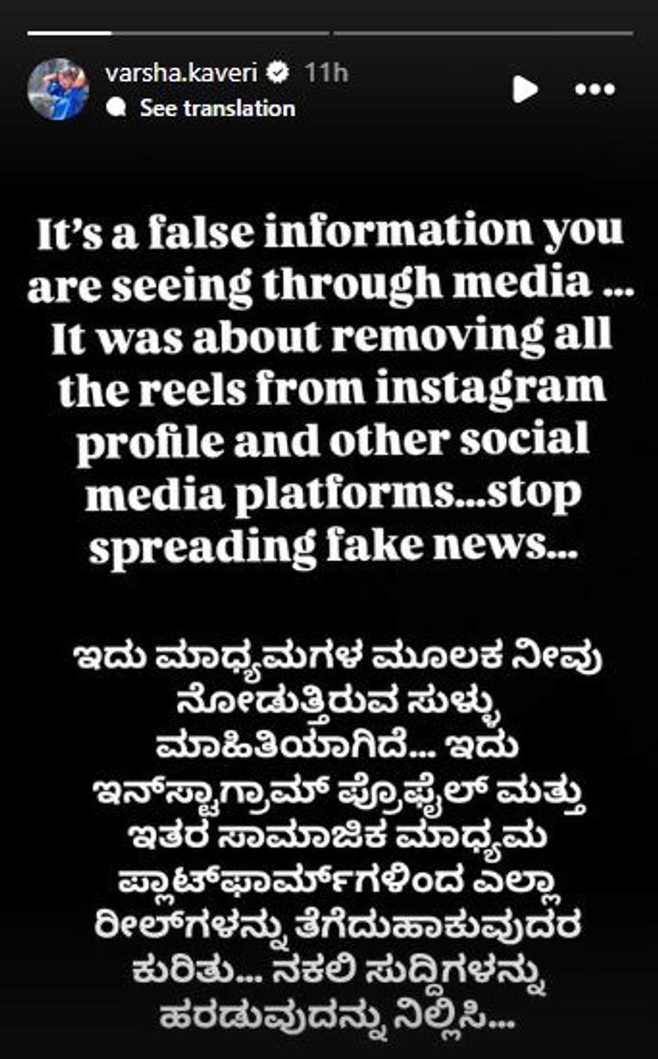 'ಸಾಮಾಜಿಕ ಜಾಲತಾಣದಲ್ಲಿ ನೀವು ನೋಡುತ್ತಿರುವುದು ಫೇಕ್ ನ್ಯೂಸ್. ನಾನು ದೂರು ನೀಡಿರುವುದು ನಮ್ಮ ರೀಲ್ಸ್ ಮತ್ತು ಫೋಟೋಗಳನ್ನು ಗೂಗಲ್ನಿಂದ ಡಿಲೀಟ್ ಮಾಡುವುದಕ್ಕೆ. ದಯವಿಟ್ಟು ಫೇಕ್ ನ್ಯೂಸ್ ಹರಡಿಬೇಡಿ' ಎಂದು ವರ್ಷ ಕಾವೇರಿ ಬರೆದುಕೊಂಡಿದ್ದಾರೆ.