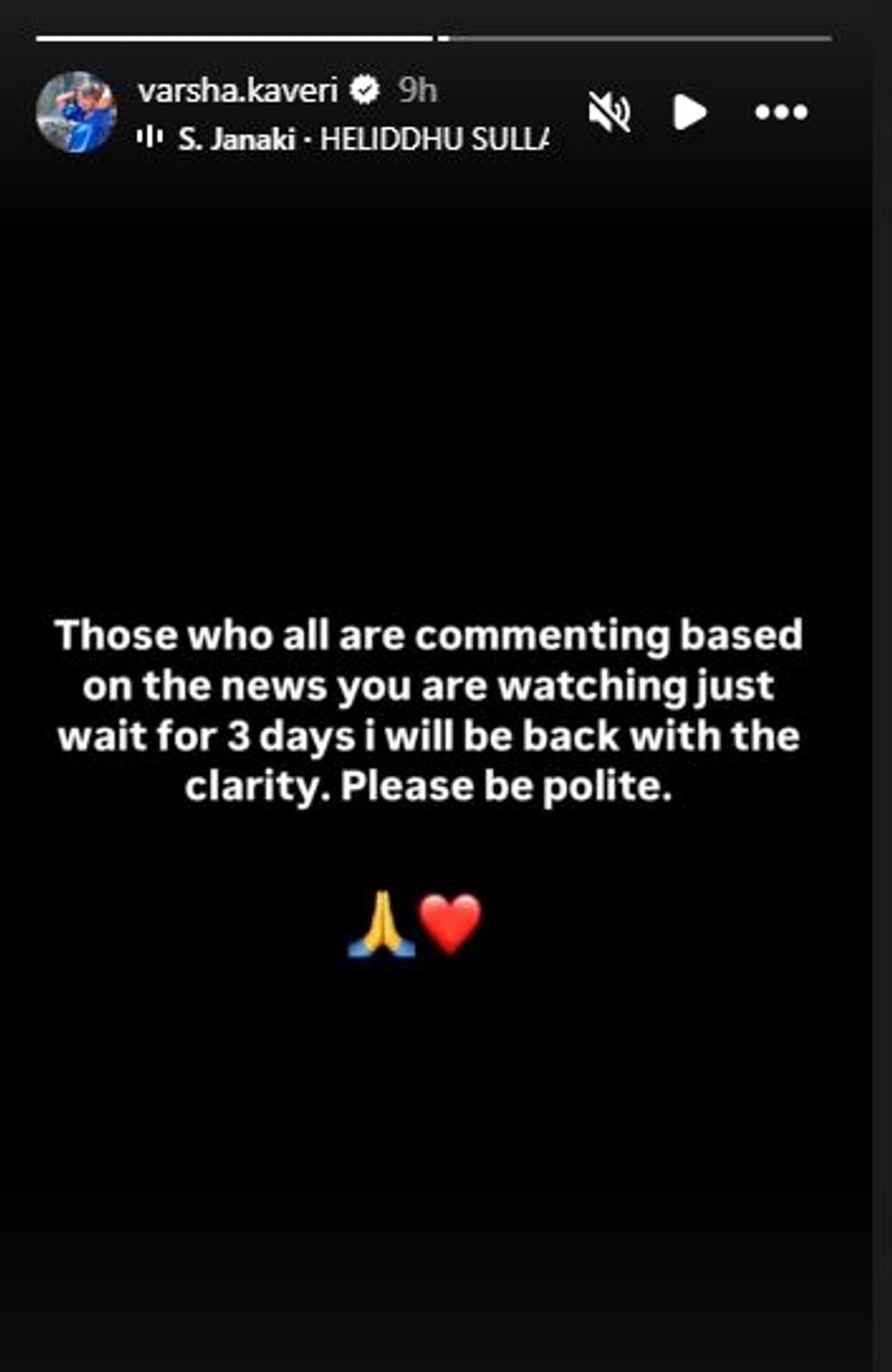 'ಯಾರೆಲ್ಲಾ ಹರಿದಾಡುತ್ತಿರುವ ನ್ಯೂಸ್ ನೋಡಿಕೊಂಡು ಕಾಮೆಂಟ್ ಮಾಡುತ್ತಿದ್ದೀರಿ ದಯವಿಟ್ಟು ಮೂರು ದಿನಗಳ ಕಾಯಬೇಕಿದೆ. ಸ್ಪಷ್ಟವಾಗಿ ಕ್ಲಾರಿಟಿ ಕೊಡಲು ನಿಮ್ಮ ಮುಂದೆ ಬರುತ್ತೀನಿ' ಎಂದು ವರ್ಷ ಹೇಳಿದ್ದಾರೆ.