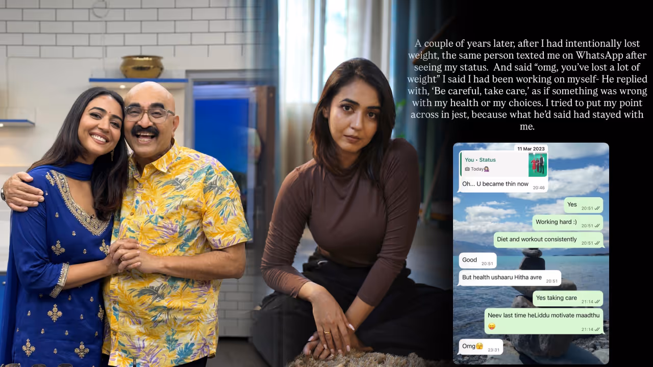 ಕೆಲವು ವರ್ಷಗಳ ನಂತರ, ನಾನು ಉದ್ದೇಶಪೂರ್ವಕವಾಗಿ ತೂಕ ಇಳಿಸಿಕೊಂಡೆ. ಅದೇ ವ್ಯಕ್ತಿ ನನಗೆ ವ್ಯಾಟ್ಸಪ್ ಮೆಸೇಜ್ ಮಾಡಿದರು. “ಓಹ್ ಮೈ ಗಾಡ್, ನೀವು ಸಿಕ್ಕಾಪಟ್ಟೆ ಸಣ್ಣ ಆಗಿದ್ದೀರಿ ಎಂದರು. ನಾನು ನನ್ನ ಮೇಲೆ ವರ್ಕ್ ಮಾಡುತ್ತಿದ್ದೇನೆ ಎಂದು ಹೇಳಿದೆ. ಆಮೇಲೆ ಅವರು ಹುಷಾರಾಗಿರಿ, ಕಾಳಜಿ ಮಾಡಿ ಎಂದರು. ನನ್ನ ಆರೋಗ್ಯ ಅಥವಾ ನಾನು ಮಾಡಿದ್ದು ಏನಾದರೂ ತಪ್ಪಾಗಿದೆಯಾ ಎಂದು ಯೋಚನೆ ಮಾಡಿದೆ. ಅವರು ಹೇಳಿದ ಮಾತು ಮನಸ್ಸಿನಲ್ಲಿಯೇ ಉಳಿದುಕೊಂಡಿತ್ತು” ಎಂದು ಅವರು ಹೇಳಿದ್ದಾರೆ.