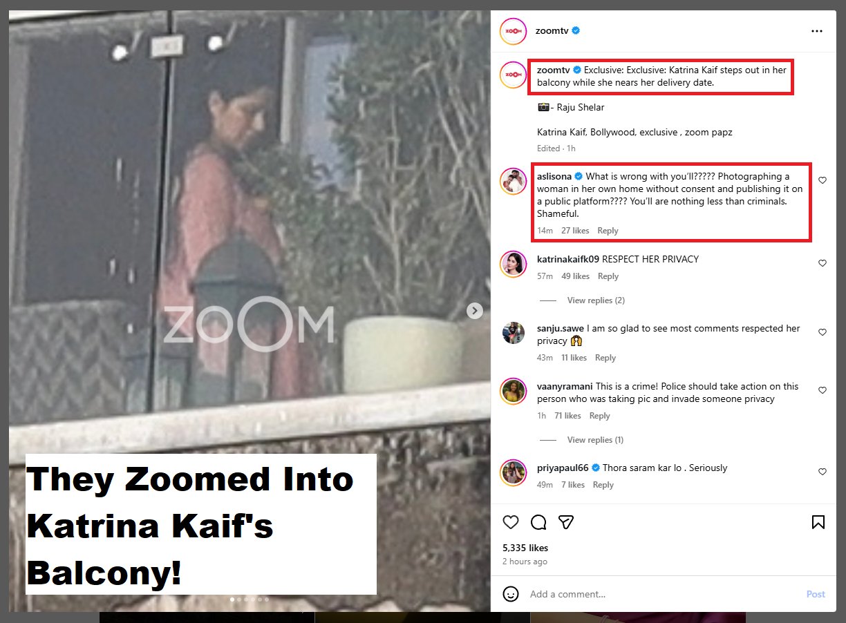 ಮೀಡಿಯಾ ಪೋರ್ಟಲ್ ಜೂಮ್, ಕತ್ರಿನಾ ಕೈಫ್ ತಮ್ಮ ಅಪಾರ್ಟ್ಮೆಂಟ್ನ ಬಾಲ್ಕನಿಯಲ್ಲಿರುವ ಫೋಟೋವನ್ನು ಪೋಸ್ಟ್ ಮಾಡಿತ್ತು. ಡೆಲಿವರಿ ಡಿನ ಹತ್ತಿರುವ ಬರುತ್ತಿದ್ದಂತೆ ಕತ್ರಿನಾ ಕೈಫ್ ಹೀಗೆ ಕಾಣುತ್ತಿದ್ದಾರೆ ಎಂದು ಫೋಟೋ ಸಹಿತ ಜೂಮ್ ಪೋಸ್ಟ್ ಮಾಡಿತ್ತು. ಇದನ್ನು ಕೆಲವು ಮಾಧ್ಯಮಗಳು ಸುದ್ದಿ ಮಾಡಿದ್ದವು. ಆದರೆ, ವಿರೋಧ ವ್ಯಕ್ತವಾಗುತ್ತಿದ್ದಂತೆ ಜೂಮ್ ತನ್ನ ಇನ್ಸ್ಟಾಗ್ರಾಮ್ ಖಾತೆಯಿಂದ ಫೋಟೋವನ್ನು ಡಿಲೀಟ್ ಮಾಡಿದೆ.