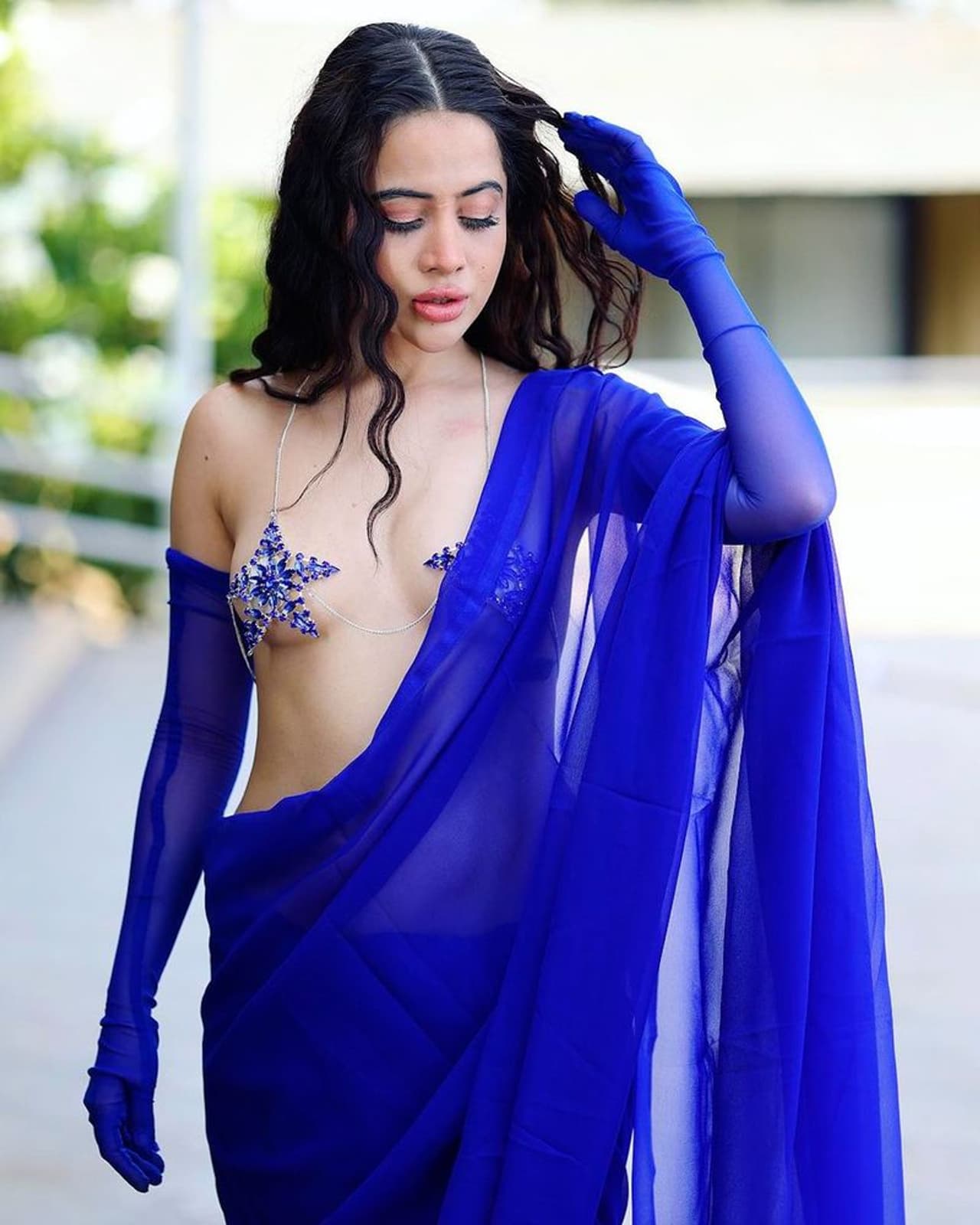 ಉರ್ಫಿಯ ಬಹುತೇಕ ಅವತಾರಗಳು ಟಾಪ್ ಲೆಸ್. ಈ ಬಾರಿಯೂ ಇದೇ ಟಾಪ್ಲೆಸ್ ಅವತಾರದಲ್ಲೇ ಕಾಣಿಸಿಕೊಂಡಿದ್ದಾರೆ. ಈ ಬಾರಿ ಉರ್ಫಿ ಜಾವೆದ್ ನೀಲಿ ಸೀರೆಯಲ್ಲಿ ಕಂಗೊಳಿಸಿದ್ದಾರೆ. ಆದರೆ ಟಾಪ್ಲ್ಲಿ ಬ್ಲೂ ಸ್ಟಾರ್ ನೇತು ಹಾಕಿ ಮೈಮಾಟ ಪ್ರದರ್ಶಿಸಿದ್ದಾರೆ. ಮೈಯಲ್ಲಿ ಬ್ಲೌಸ್ ಇಲ್ಲದಿದ್ದರೂ ಕೈಗೆ ಗ್ಲೌಸ್ ಹಾಕಿ ಒಂದಷ್ಟು ಮ್ಯಾಚ್ ಮಾಡಿದ್ದಾರೆ.