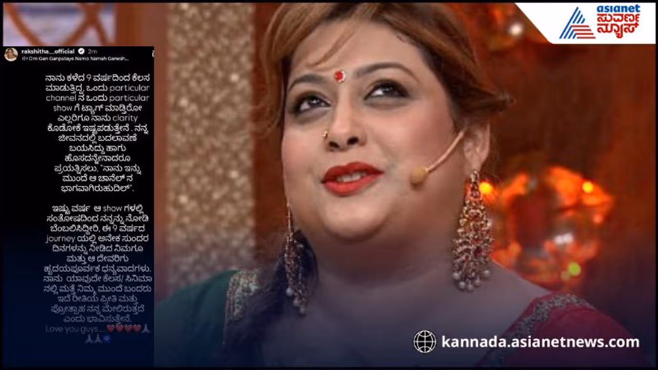 ನಟಿ ರಕ್ಷಿತಾ ಪ್ರೇಮ್, ಜೀ ಕನ್ನಡದ ಎರಡೂ ಶೋಗಳಿಂದ ಹೊರ ಬಿದ್ದಿದ್ದಾರೆ. ಕಾಮಿಡಿ ಕಿಲಾಡಿಗಳು ಮತ್ತು ಡಾನ್ಸ್ ಕರ್ನಾಟಕ ಡಾನ್ಸ್ ಶೋನಿಂದ ಹೊರ ಬೀಳಲು ಕಾರಣ ಏನು ಎಂಬುದನ್ನೂ ಅವರು ಹೇಳಿದ್ದಾರೆ.