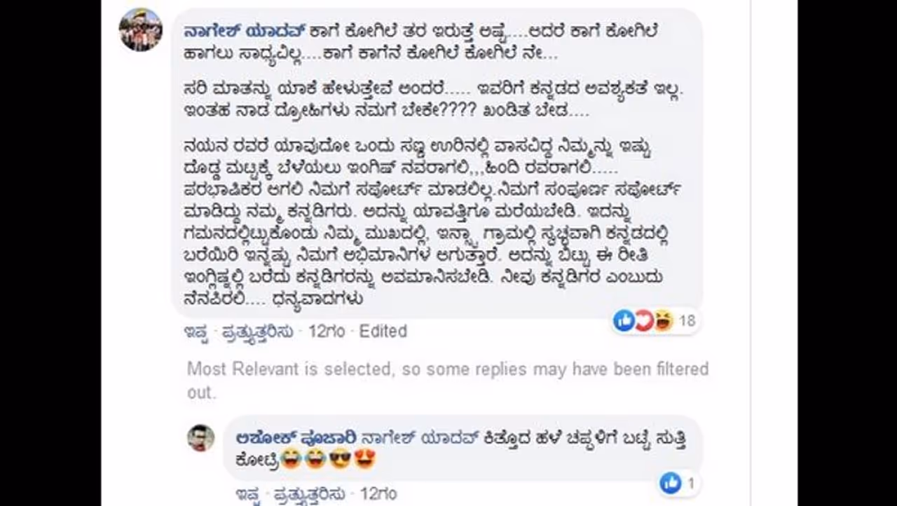 'ಫೇಮಸ್ ಆಗೋತನಕ ಕನ್ನಡ ಬೇಕು ಆಮೇಲೆ ಇಂಗ್ಲೀಷ್ ಬೇಕು' ಎಂದು ಕಾಮೆಂಟ್ ಮಾಡಿದ್ದಾರೆ. ಇದಕ್ಕೆ ಉತ್ತರಿಸಿರುವ ನಯನಾ ಅವರು 'ಅಪ್ಪಾ ಕನ್ನಡದ ಭಕ್ತ ಮುಚ್ಕೊಂಡ್ ನಿನ್ನ ಕೆಲಸ ನೋಡ್ಕೋ' ಎಂದು ರಿಪ್ಲೈ ಮಾಡಿದ್ದಾರೆ. ಇದನ್ನು ಗಮನಿಸಿದ ನೆಟ್ಟಿಗರು ನಯನಾ ವಿರುದ್ಧ ಗರಂ ಆಗಿದ್ದಾರೆ.
