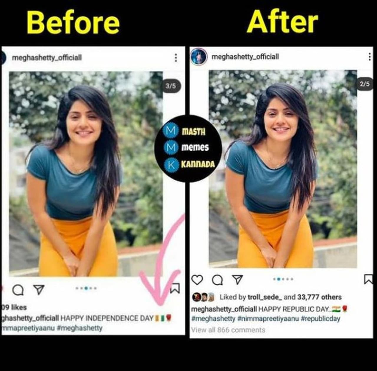 ಈ ಫೋಟೋಗೆ ಬಂದಿರುವ ಕಾಮೆಂಟ್ಗಳ ಪ್ರಕಾರ ಮೇಘಾ ಶೆಟ್ಟಿ ತಿಳಿಯದೇ ಹಾಕಿದ್ದರೂ ಅದನ್ನು ತಕ್ಷಣವೇ ಡಿಲೀಟ್ ಮಾಡಿದ್ದಾರೆ, ತಿಳಿಯದೇ ಮಾಡಿರುವ ತಪ್ಪಿಗೆ ಟ್ರೋಲ್ ಮಾಡುವ ಅವಶ್ಯಕತೆ ಇಲ್ಲ ಎಂದು ಅಭಿಮಾನಿಗಳು ಅನು ಪರವೂ ಬ್ಯಾಟಿಂಗ್ ಮಾಡಿದ್ದಾರೆ. ಈ ಹಿಂದೆ ಖಾಸಗಿ ಸಂದರ್ಶನದಲ್ಲಿ ಮೇಘಾ ಶೆಟ್ಟಿ, ಬಣ್ಣದ ಲೋಕಕ್ಕೆ ಬಾರದಿದ್ದರ IAS ಅಧಿಕಾರಿ ಆಗುತ್ತಿದ್ದೆ ಎಂದಿದ್ದರು. ಇದೇ ಮಾತನ್ನು ನೆನೆದು ಟ್ರೋಲಿಗರು ನಿಮಗೆ ಭಾರತದ ಧ್ವಜ ಯಾವುದು ಅಂತಾನೇ ಗೊತ್ತಿಲ್ಲ, ಪರೀಕ್ಷೆ ಹೇಗೆ ಪಾಸ್ ಆಗುತ್ತೀರಾ ಎಂದು ಪ್ರಶ್ನೆ ಮಾಡಿದ್ದಾರೆ. ಕೆಲವು ನೆಟ್ಟಿಗರ ಮೂಗಿನ ನೇರಕ್ಕೆ ನೋಡಿದರೆ ಮೇಘಾ ಶೆಟ್ಟಿ ಕಾಲು ಎಳೆಯುವುದಕ್ಕೆ ಪೋಟೋವನ್ನು ಸುಳ್ಳು ಸುಳ್ಳಾಗಿ ಹೀಗೆ ಎಡಿಟ್ ಮಾಡಿದ್ದಾರೆ ಎನ್ನಲಾಗಿದೆ.