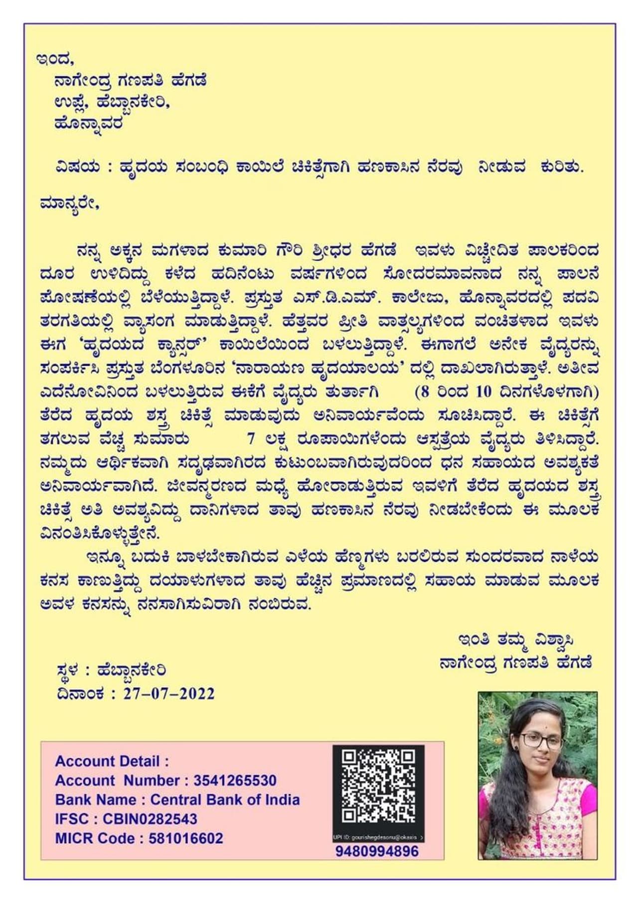 ಗೌರಿ ಚಿಕ್ಕಂದಿನಿಂದಲೇ ಹೆತ್ತರ ಪ್ರೀತಿ ವಾತ್ಸಲ್ಯಗಳಿಂದ ವಂಚಿತರಾಗಿದ್ದಾರೆ. ಈಕೆಯ ಆರೋಗ್ಯ ಸಮಸ್ಯೆಗೆ ನಮ್ಮ ಮಟ್ಟದಲ್ಲಿ ಚಿಕಿತ್ಸೆ ನೀಡಿ ಗುಣಪಡಿಸುವ ಪ್ರಯತ್ನ ಮಾಡಿದ್ದೇವೆ. ಆದರೆ ಸುಧಾರಿಸಿಲ್ಲ. ಹೀಗಾಗಿ ನಾರಾಯಣ ಹೃದಯಾಲದಲ್ಲಿ ದಾಖಲಿಸಿದ್ದೇವೆ. ಜೀವನ್ಮರಣ ಹೋರಾಟ ಮಾಡುತ್ತಿರುವ ಗೌರಿಗೆ 8 ರಿಂದ 10 ದಿನದೊಳಗೆ ಶಸ್ತ್ರಚಿಕಿತ್ಸೆ ಮಾಡಬೇಕಿದೆ. ಆದರೆ ಇಷ್ಟು ಹಣ ಹೊಂದಿಸಲು ನಮಗೆ ಅಸಾಧ್ಯವಾಗಿದೆ. ನಮ್ಮದು ಬಡ ಕುಟುಂಬವಾಗಿದೆ. ಗೌರಿಯನ್ನು ಬದುಕಿಸಲು ನಾವು ಶಕ್ತಿಮೀರಿ ಪ್ರಯತ್ನಿಸುತ್ತಿದ್ದೇವೆ. ಬದುಕಿ ಬಾಳಬೇಕಾದ ವಿದ್ಯಾರ್ಥಿನಿಗೆ ದಾನಿಗಳ ನೆರವು ಬೇಕಿದೆ. ಸುಂದರ ನಾಳೆಯ ಕನಸು ಕಾಣುತ್ತಿರುವ ಗೌರಿಗೆ ನಿಮ್ಮ ಕೈಲಾದ ಸಹಾಯ ಮಾಡಬೇಕು ಎಂದು ನಾಗೇಂದ್ರ ಗಣಪತಿ ಹೆಗಡೆ ಮನವಿ ಮಾಡಿದ್ದಾರೆ.