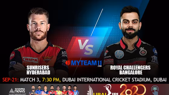 ದುಬೈ(ಸೆ.21): 13ನೇ ಆವೃತ್ತಿಯ ಐಪಿಎಲ್ ಟೂರ್ನಿಯಲ್ಲಿಂದು ರಾಯಲ್ ಚಾಲೆಂಜರ್ಸ್ ಬೆಂಗಳೂರು ತಂಡ ಡೇವಿಡ್ ವಾರ್ನರ್ ನೇತೃತ್ವದ ಸನ್ರೈಸರ್ಸ್ ಹೈದರಾಬಾದ್ ವಿರುದ್ಧ ತನ್ನ ಅಭಿಯಾನ ಆರಂಭಿಸಲಿದೆ.